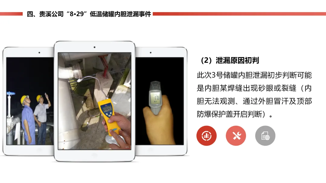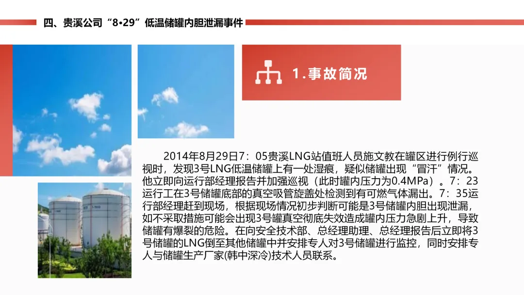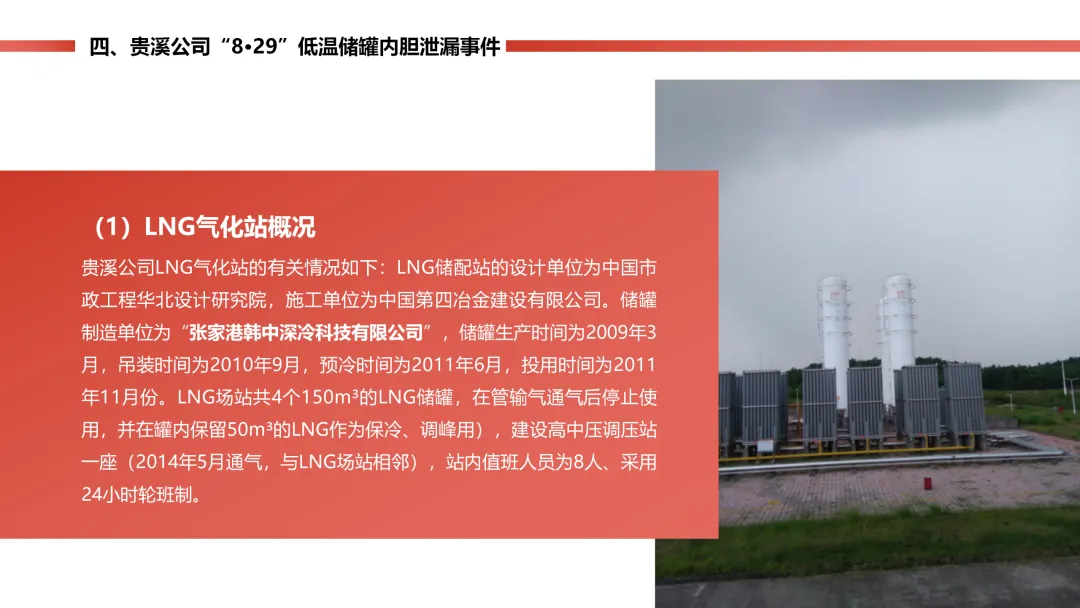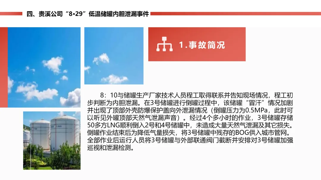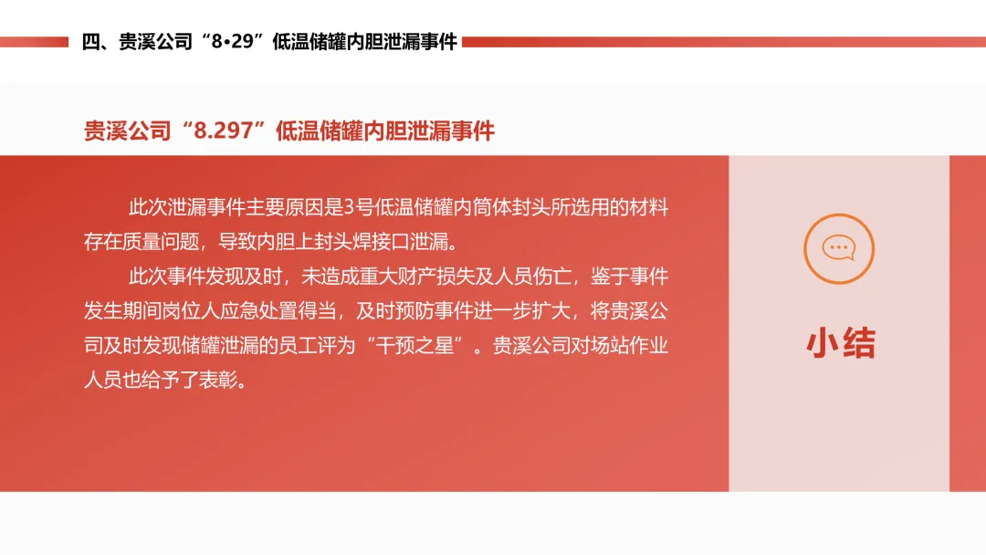 燃气站的低温天然气储罐内胆,因为材料质量有问题,封头焊口裂了漏气,工作人员巡检时及时发现了 “冒汗” 的异常。公司立马启动预案,把罐里的气倒到其他罐里,没造成人员伤亡,只损失了点气、储罐停工 8 个月。后续储罐返厂维修,还排查了同批次材料的其他储罐,也表彰了处置得当的工作人员。