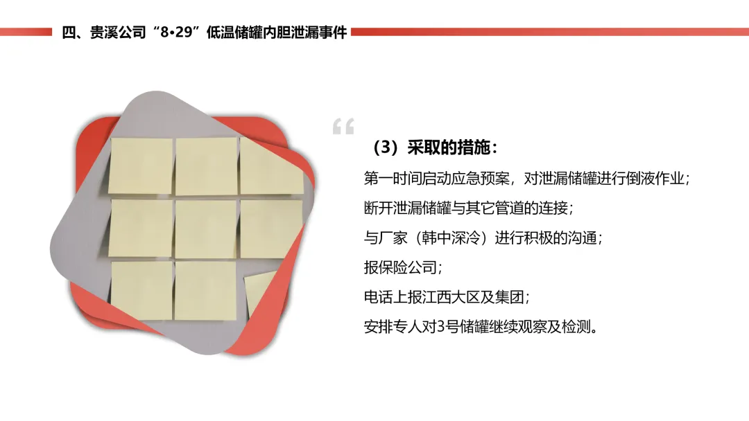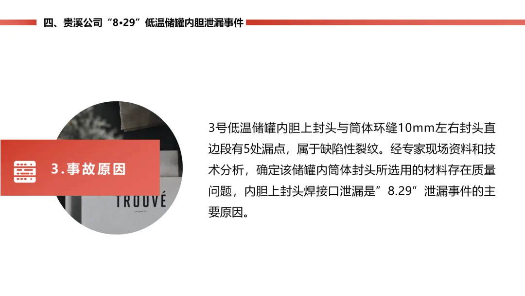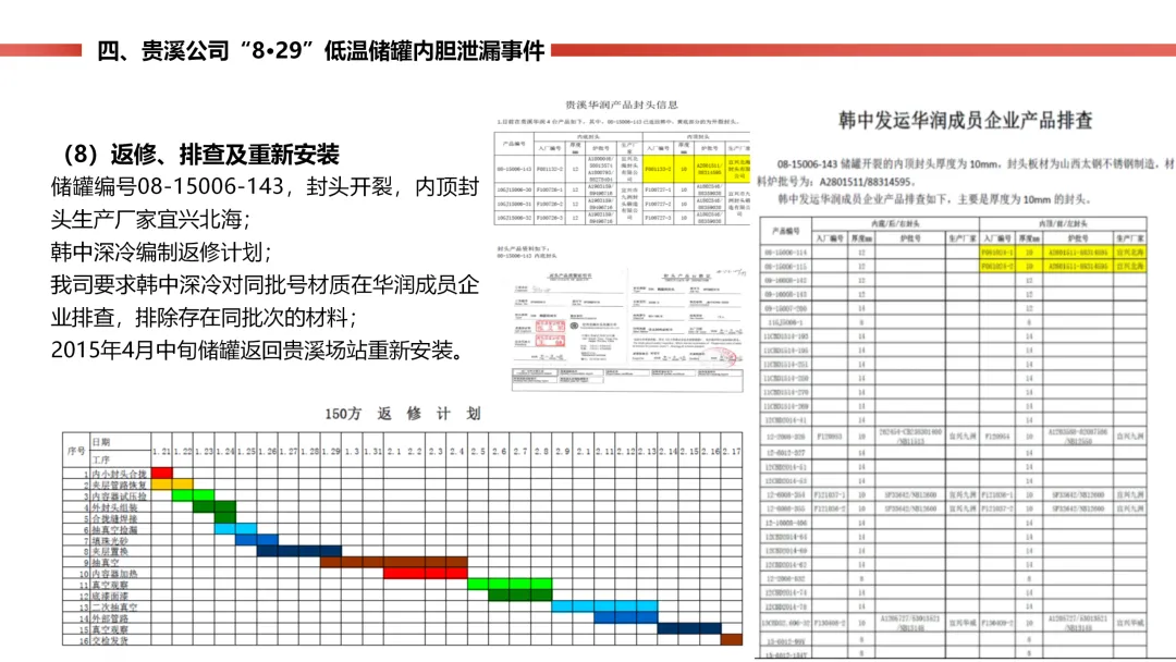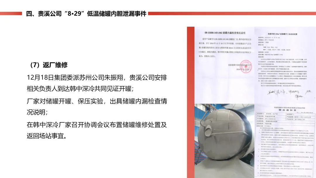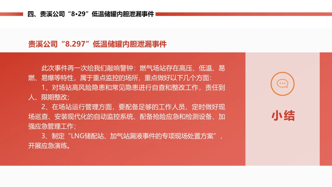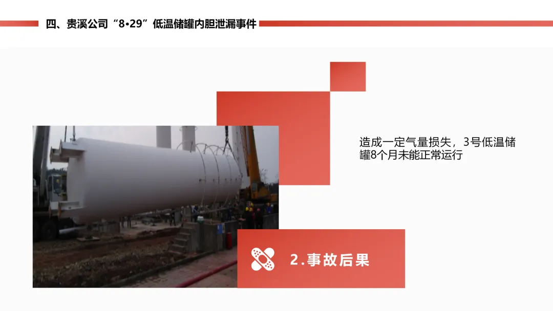 燃气站的低温天然气储罐内胆,因为材料质量有问题,封头焊口裂了漏气,工作人员巡检时及时发现了 “冒汗” 的异常。公司立马启动预案,把罐里的气倒到其他罐里,没造成人员伤亡,只损失了点气、储罐停工 8 个月。后续储罐返厂维修,还排查了同批次材料的其他储罐,也表彰了处置得当的工作人员。