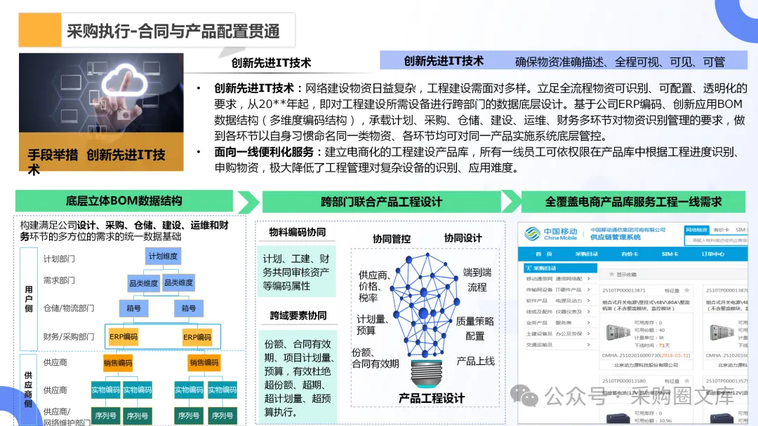 这套体系从三个维度展开:一是底层数据的标准化,通过BOM结构与产品库,统一设计、采购、仓储、运维、财务各环节对物资的识别和管理口径,让各方用各自习惯的方式调用统一数据;二是管控要素的刚性嵌入,将份额、合同有效期、计划量、预算等关键控制点前置到系统逻辑中,在申购、下单、验收等环节实现自动预警与硬约束;三是全流程的数字化协同,从需求源头绑定预算,到供应商发起报账,再到物资调拨与长库龄督办,形成可追溯、可追踪的流程闭环。