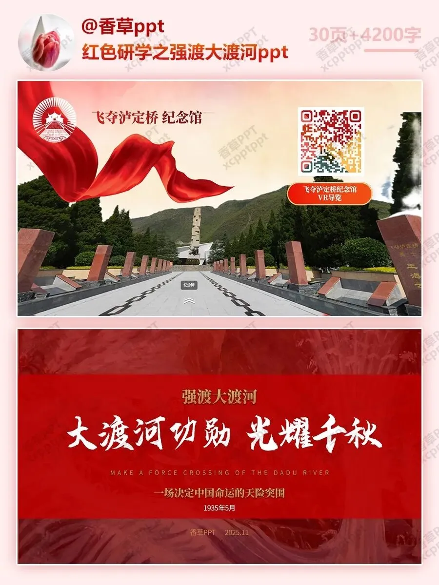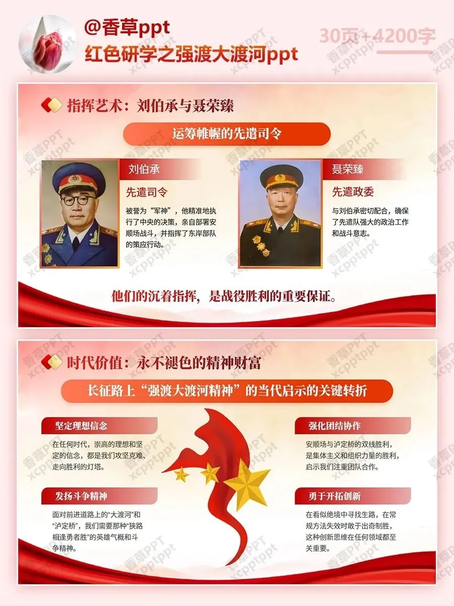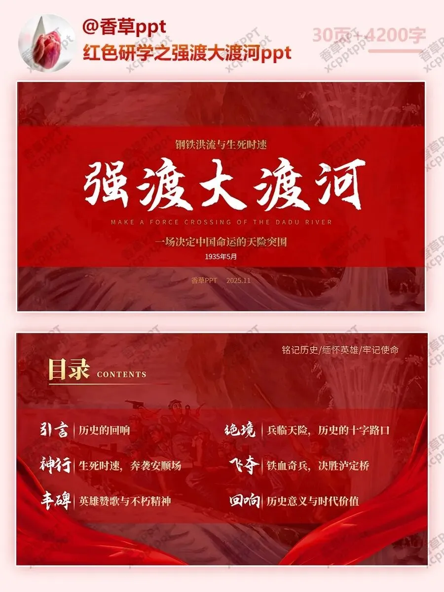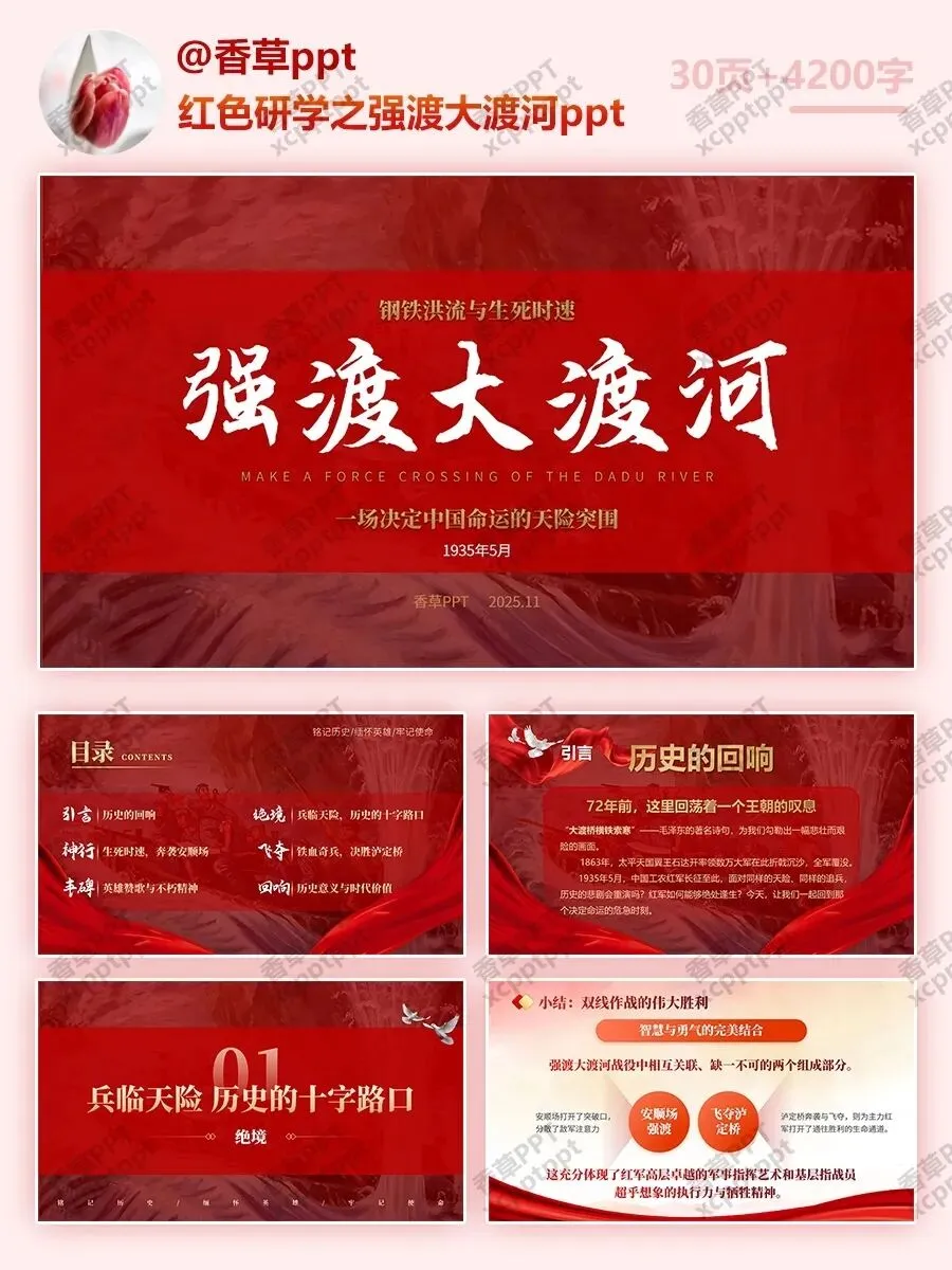 红色研学之强渡大渡河PPT分享,共30页,文字稿4200字,图文均可编辑修改