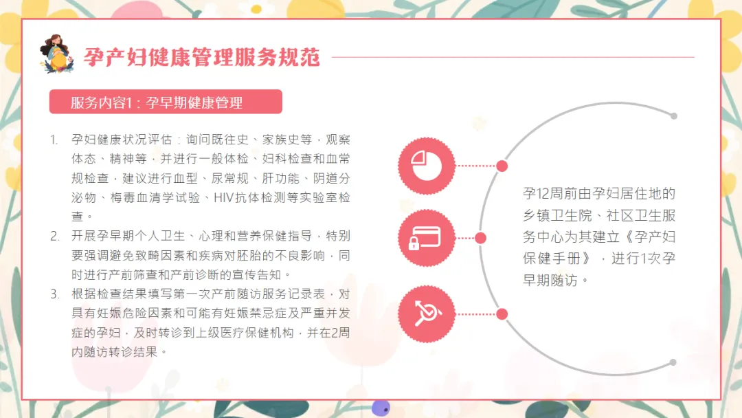 开展孕早期个人卫生、心理和营养保健指导,特别要强调避免致畸因素和疾病对胚胎的不良影响,同时进行产前筛查和产前诊断的宣传告知。