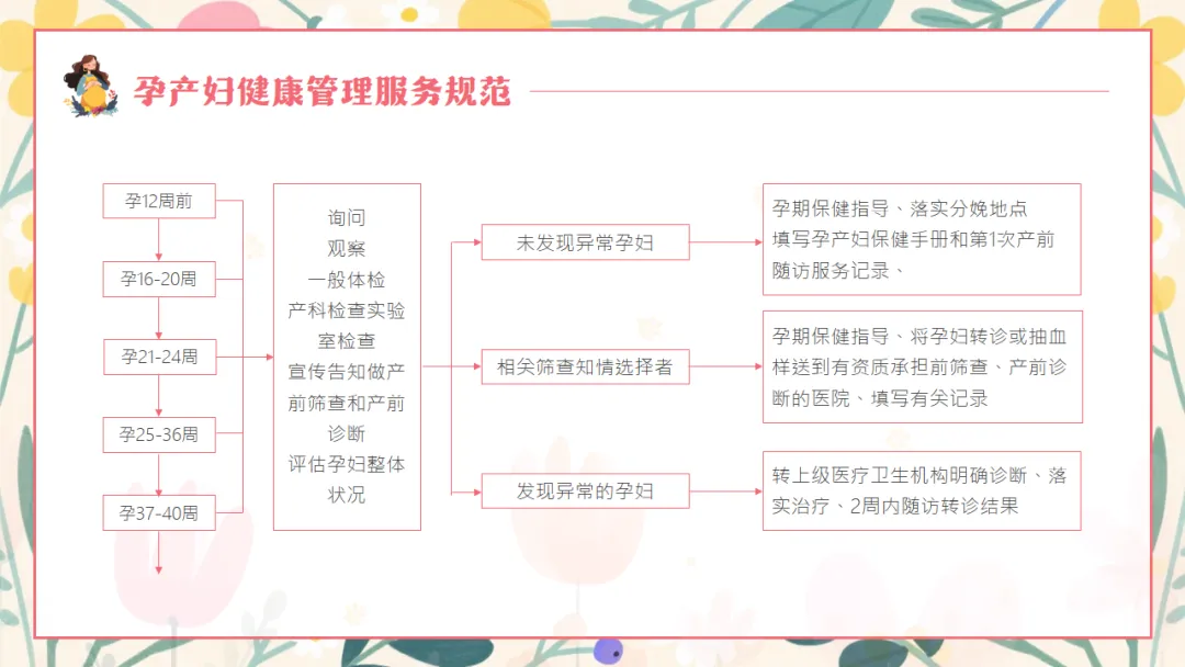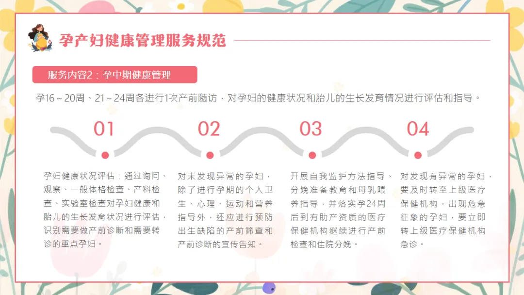 孕妇健康状况评估:通过询问、观察、一般体格检查、产科检查、实验室检查对孕妇健康和胎儿的生长发育状况进行评估,识别需要做产前诊断和需要转诊的重点孕妇。