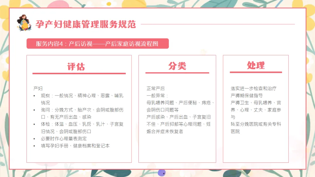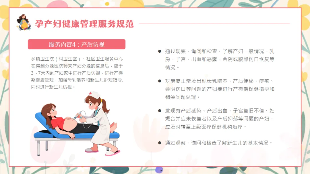 开展自我监护方法指导、分娩准备教育和母乳喂养指导,并落实孕24周后到有助产资质的医疗保健机构继续进行产前检查和住院分娩。