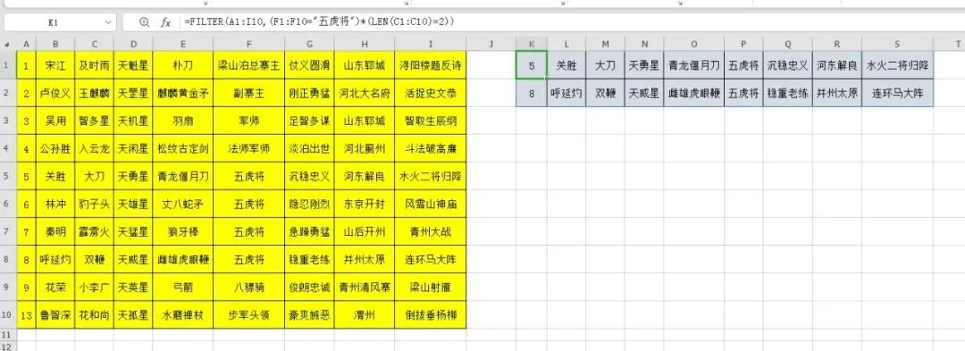 在K1输入公式=FILTER(A1:I10,(F1:F10="五虎将")*(LEN(C1:C10)=2)),公式结果自动溢出。