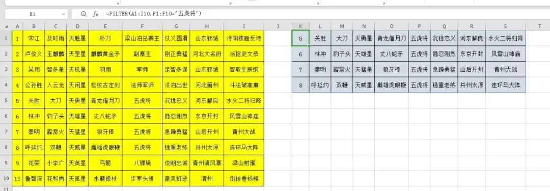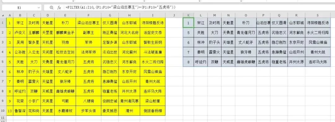 在K1输入公式=FILTER(A1:I10,(F1:F10="梁山泊总寨主")+(F1:F10="五虎将")),公式结果自动溢出。
