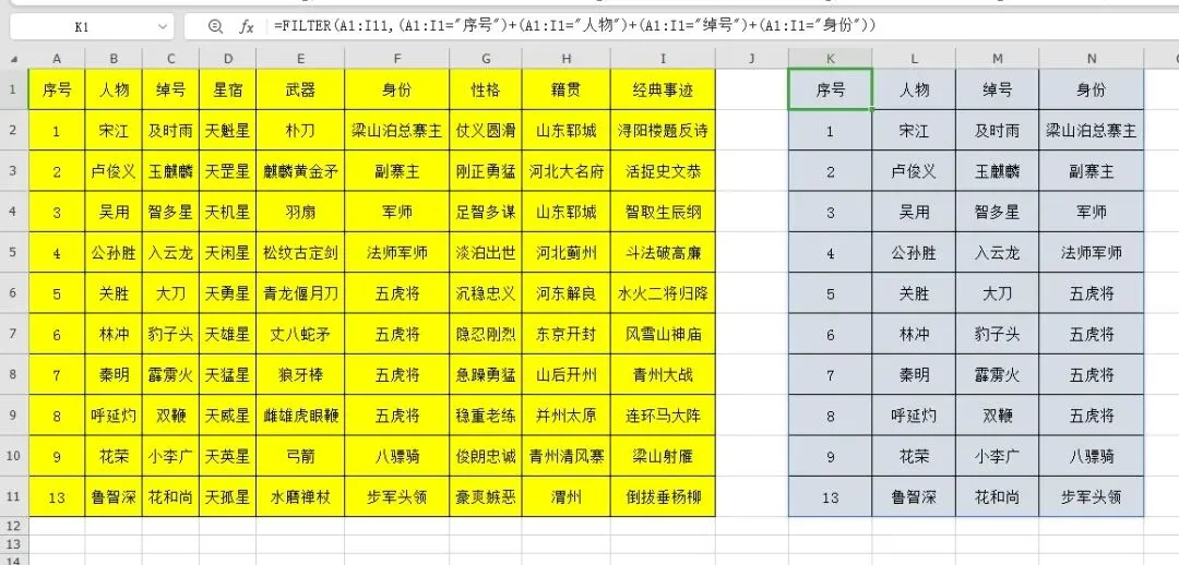 K1输入公式=FILTER(A1:I11,(A1:I1="序号")+(A1:I1="人物")+(A1:I1="绰号")+(A1:I1="身份")),结果自动溢出。
