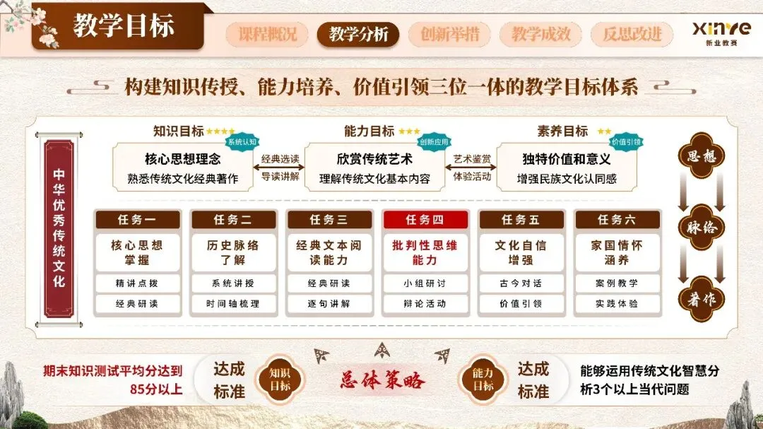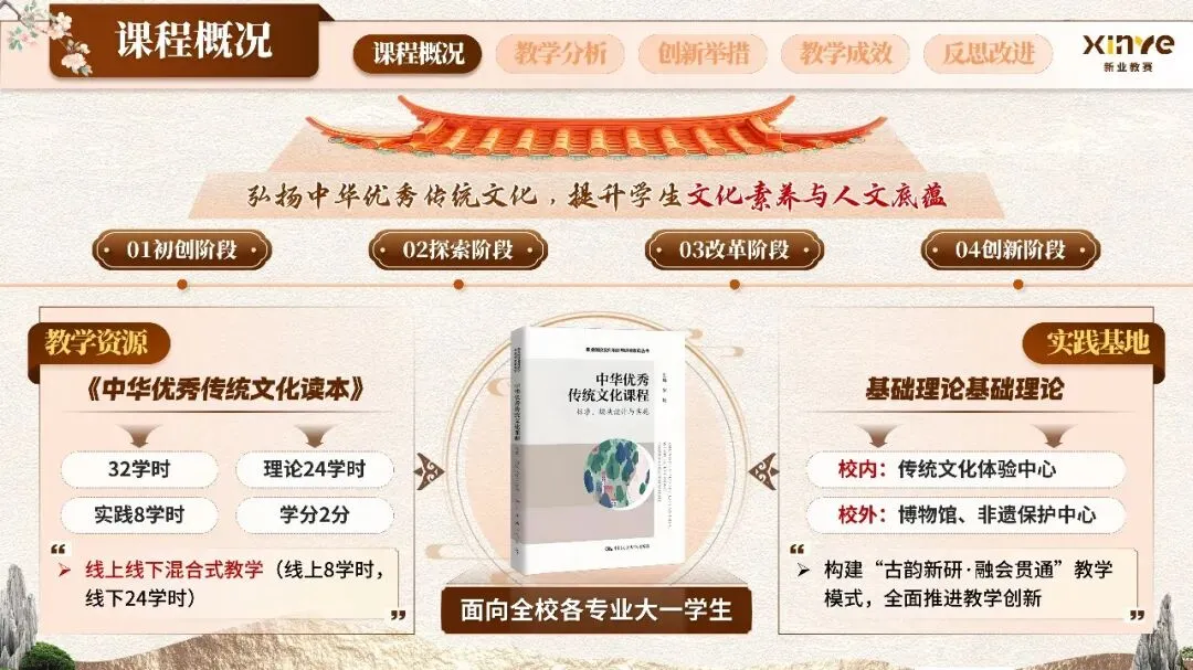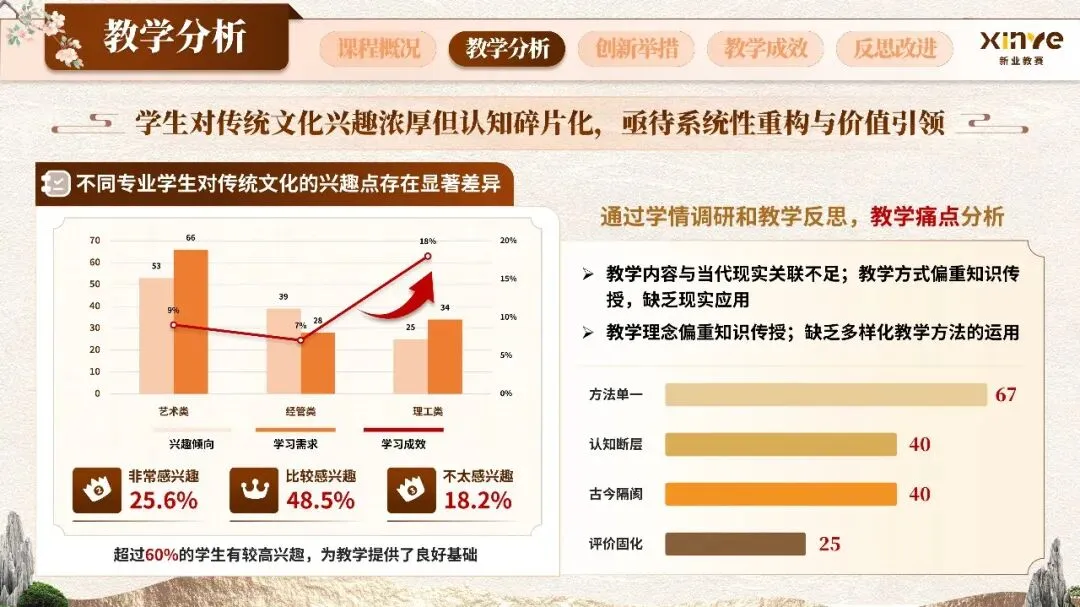 新文科背景下“弘扬中华优秀传统文化、提升学生文化素养与人文底蕴”的育人目标,以“创造性转化、创新性发展”的新时代文化观为导向,将传统文化传承与当代现实应用深度融合,契合国家关于加强中华优秀传统文化教育的战略要求。
