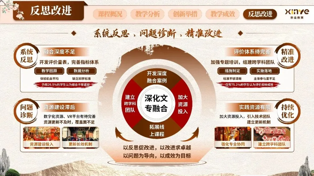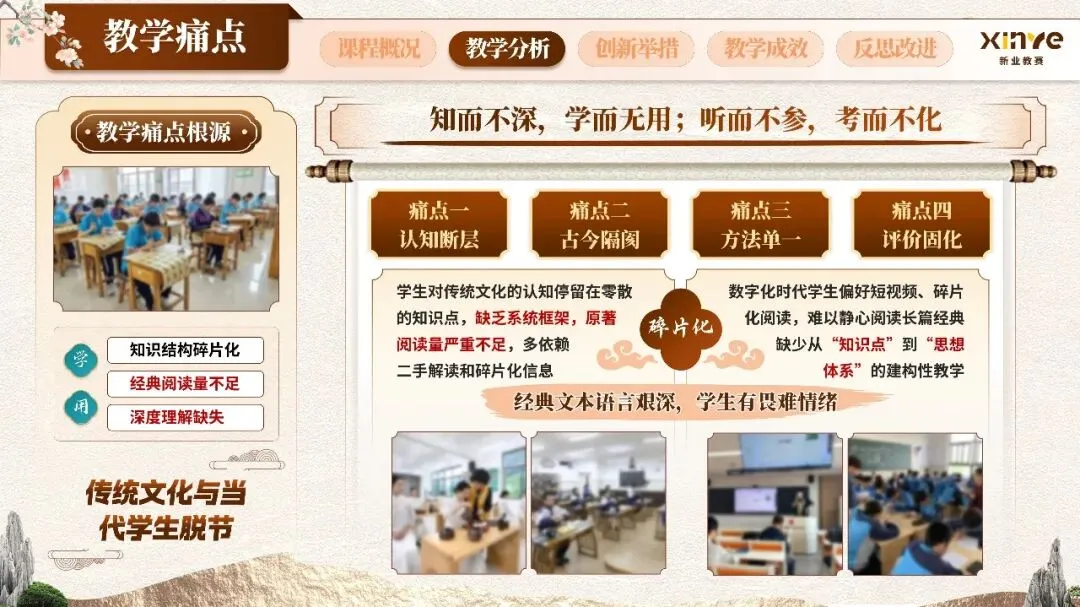 本项目聚焦“传统文化课程教学中认知断层、古今隔阂、方法单一、评价固化”等核心痛点,由教学创新团队协同完成,系统构建“古韵新研·融会贯通”教学模式,将中华优秀传统文化的精髓与专业课程教学深度融合,为高校传统文化通识课程改革提供可复制、可推广的创新范式。