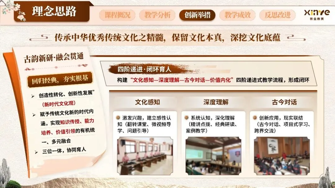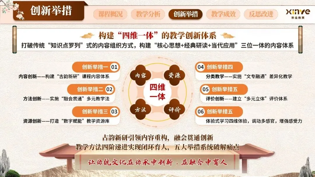 围绕“古韵新研·融会贯通”这一核心理念,系统构建四维一体的教学创新体系:内容创新方面,构建“核心思想+经典研读+当代应用”三位一体的课程内容体系;方法创新方面,通过多元方法破解“学而无用”困境;评价创新方面,建立多元立体评价体系;资源创新方面,打造数字赋能教学资源库,让传统文化可感知、可交互、可应用。