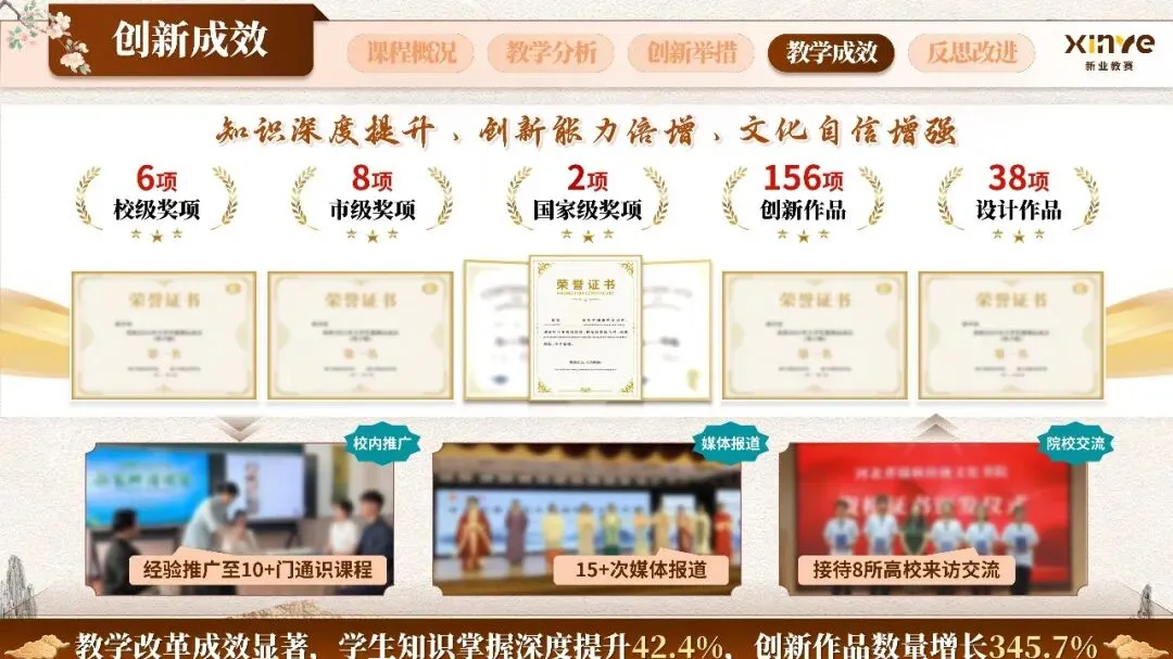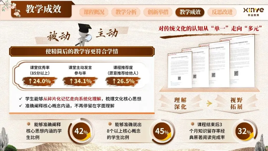 该教学模式已面向全校大一学生实施多轮,成效显著:课堂优秀率提升24%,主动发言参与率提升34.1%,课程推荐度提升26.5%。形成可复制、可推广的“古韵新研·融会贯通”教学案例与资源体系。