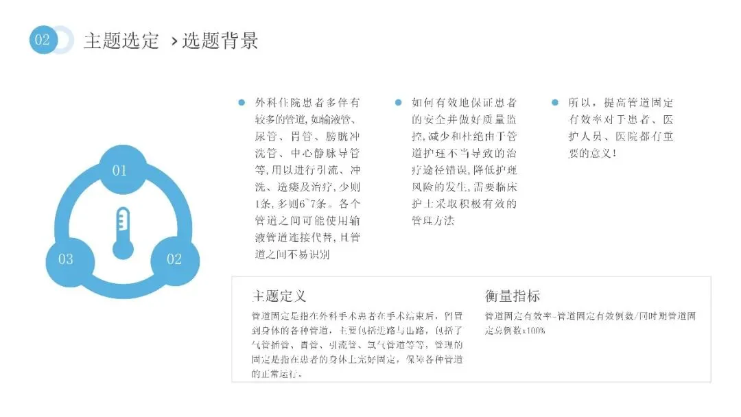在临床护理中,术后患者常常需要留置多种管道,比如胸管、胃管、引流管、导尿管等。管道护理直接关系到患者安全,一旦固定不当,容易出现滑脱、移位,不仅影响治疗,还会增加并发症和住院时间。为此,我们成立了 HHH 品管圈,围绕 “提高管道固定有效率” 展开质量改进。