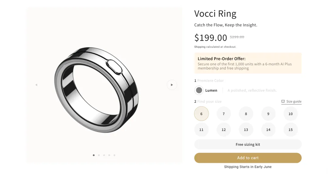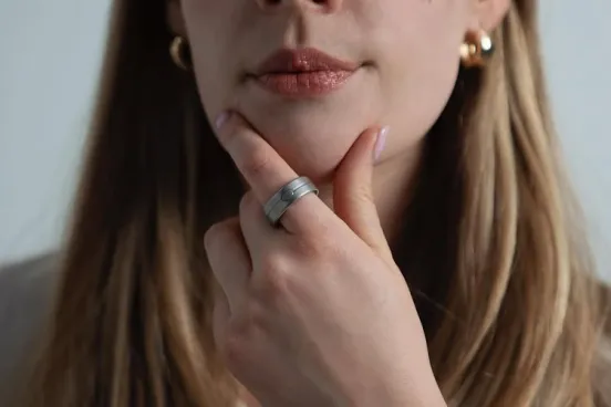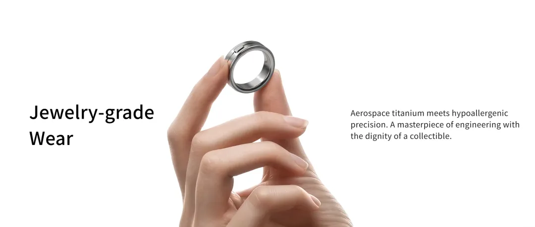 设计与工艺:Vocci Ring采用航天级钛合金材质,重量仅为3到5克,厚度2.8毫米,宽度6.8毫米,戴上比婚戒还低调。它联合顶级工作室打造,外观更偏向专业珠宝,避免了科技产品的突兀感。目前提供8种尺寸选择,支持IPX4级防水,足以应对日常使用。