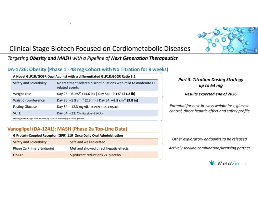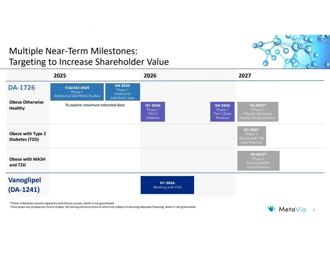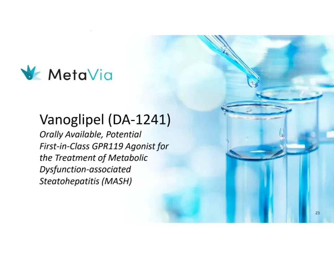 MetaVia前身NeuroBo Pharmaceuticals, Inc.,是一家临床阶段的生物技术公司,致力于开发治疗心脏代谢疾病的新型药物,目前聚焦于两大项目:Vanoglipel (DA-1241)、DA-1726,前者针对代谢功能障碍相关脂肪性肝炎(MASH)、2型糖尿病(T2DM),后者治理肥胖症。该公司尚无收入,2025年净亏损1297万美元。