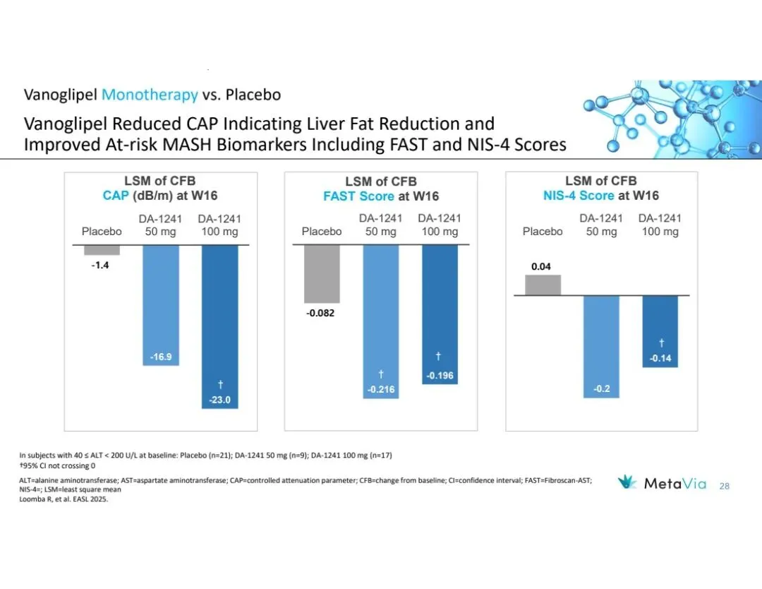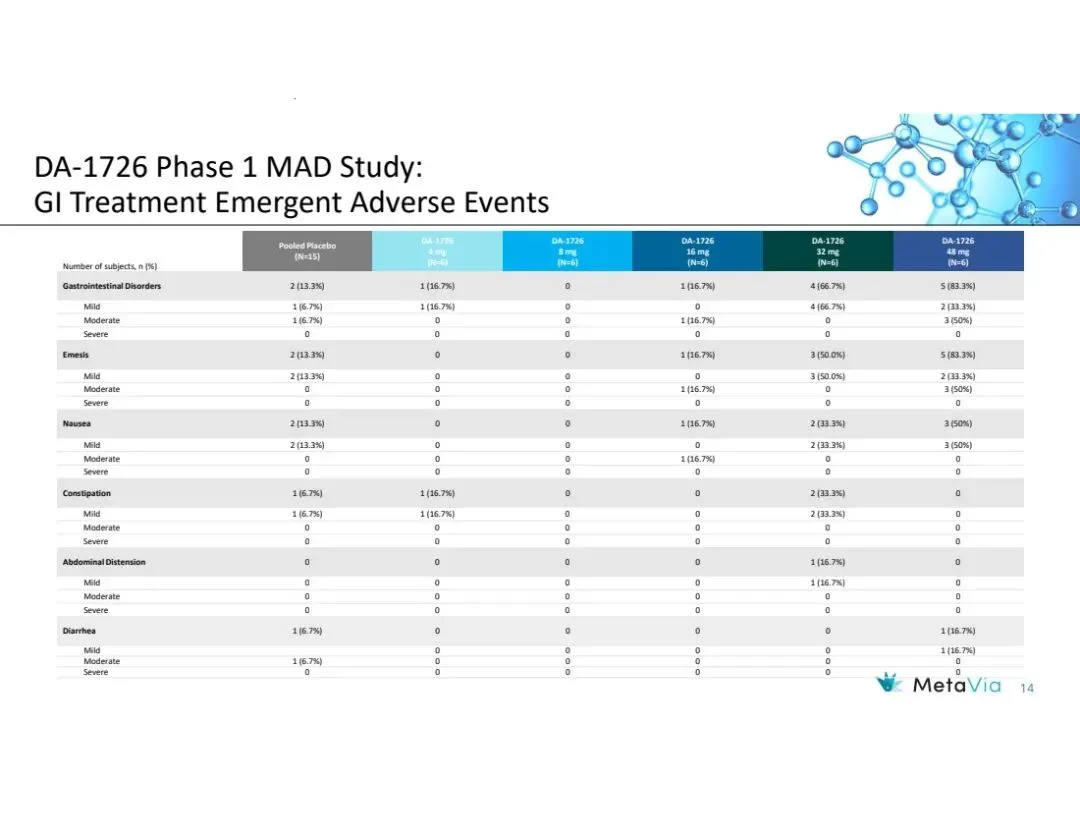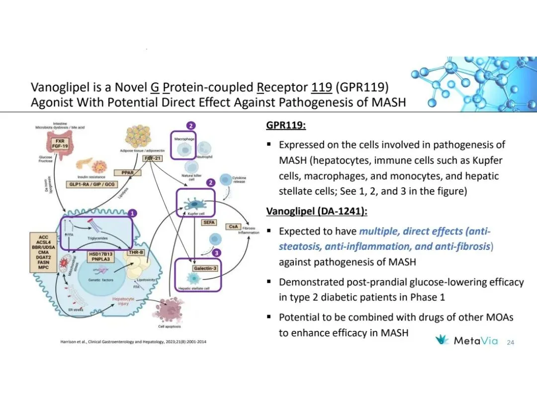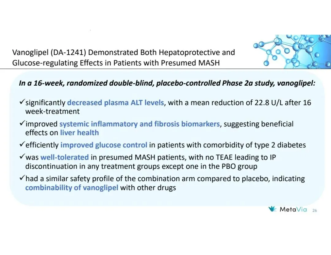 MetaVia前身NeuroBo Pharmaceuticals, Inc.,是一家临床阶段的生物技术公司,致力于开发治疗心脏代谢疾病的新型药物,目前聚焦于两大项目:Vanoglipel (DA-1241)、DA-1726,前者针对代谢功能障碍相关脂肪性肝炎(MASH)、2型糖尿病(T2DM),后者治理肥胖症。该公司尚无收入,2025年净亏损1297万美元。