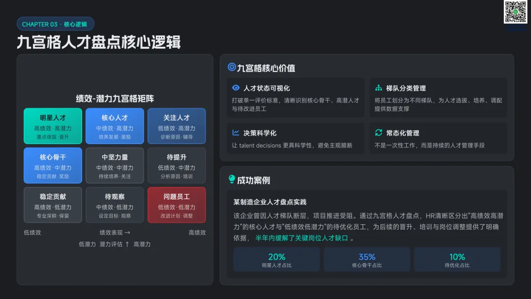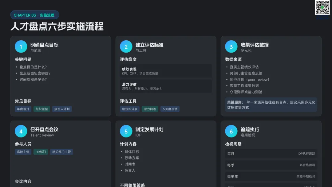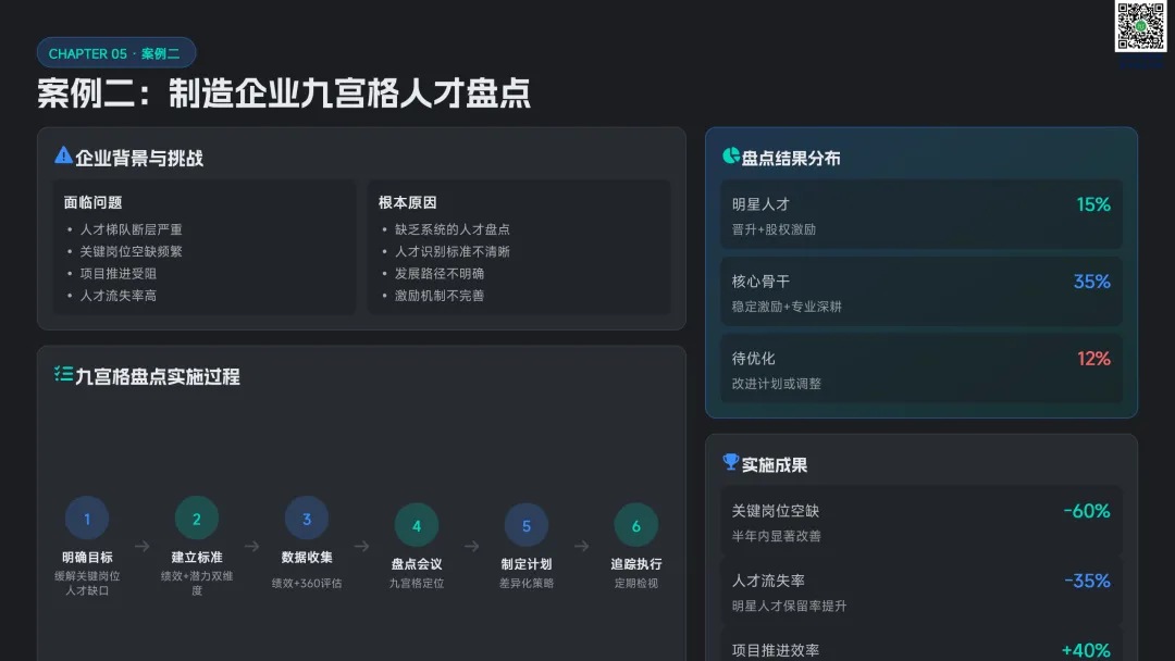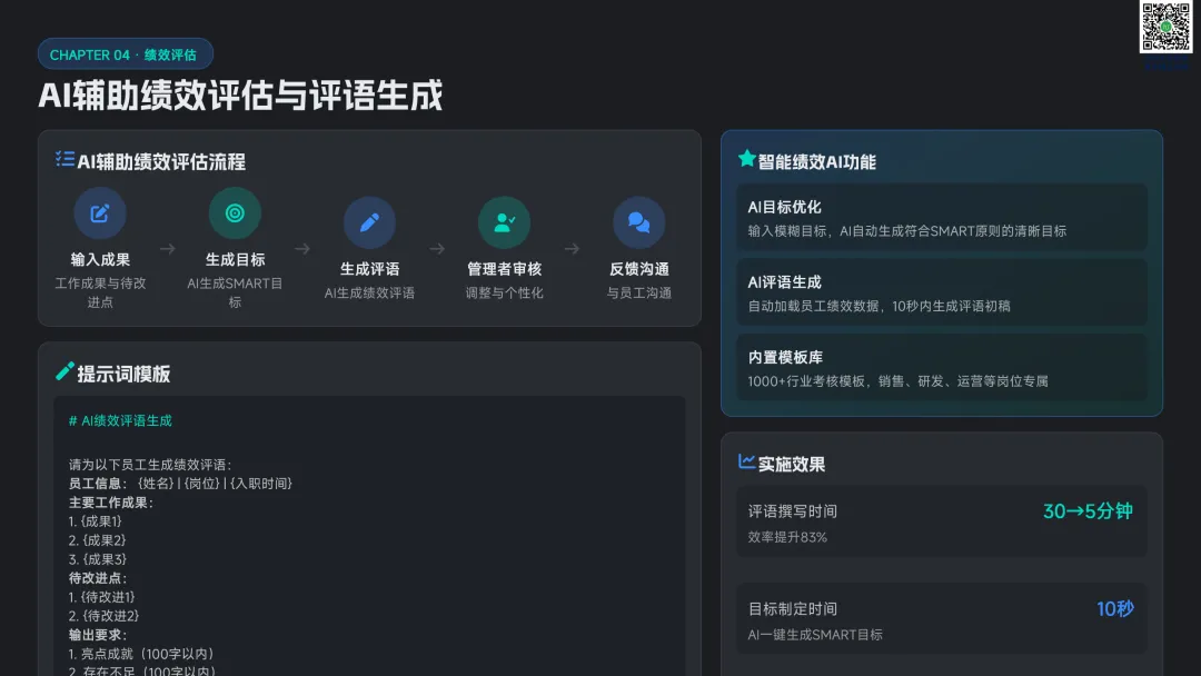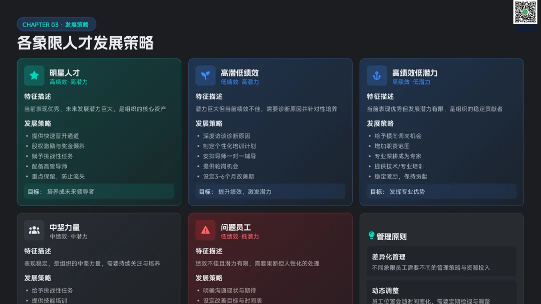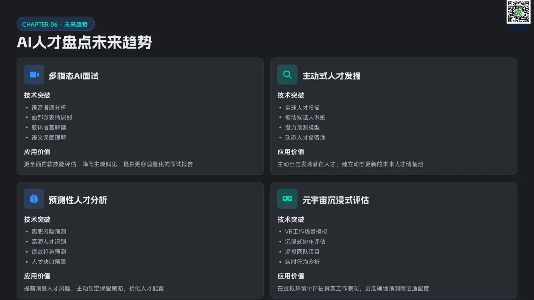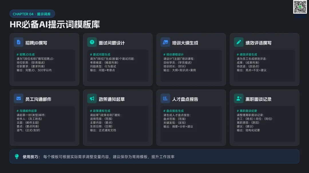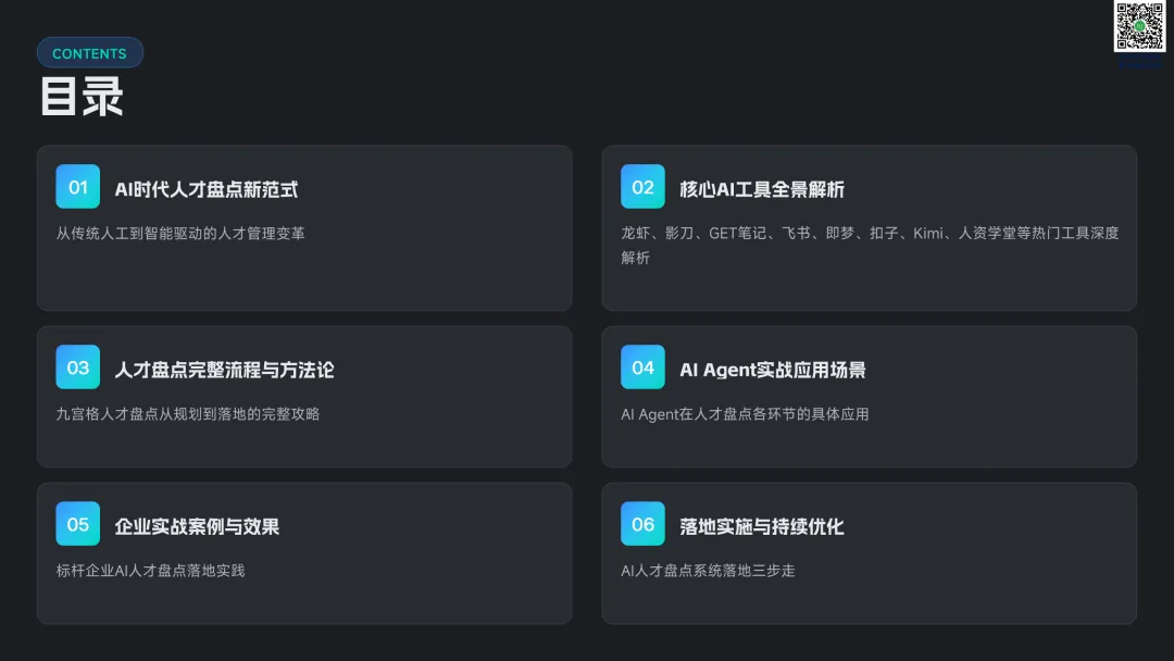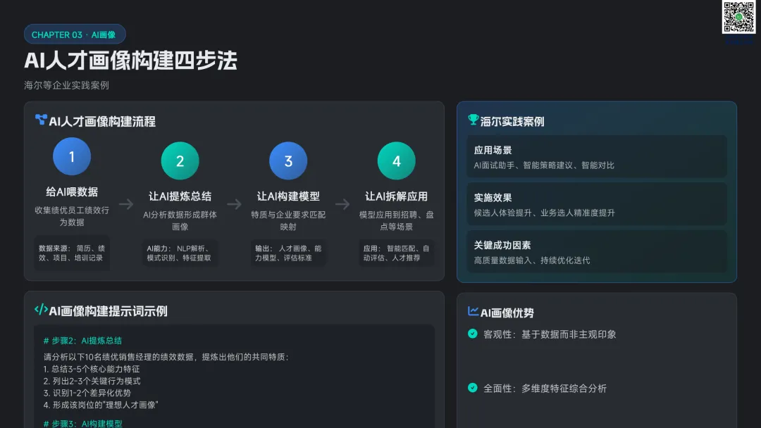 以九宫格绩效 - 潜力模型为核心,讲解人才分类标准与差异化管理策略。提供六步实施流程:明确目标→建立标准→收集数据→盘点会议→制定发展计划→追踪执行。构建四大评估维度,讲解 AI 人才画像四步法,搭配数据可视化方案,形成标准化、可落地的盘点体系。聚焦 AI 在盘点全流程的自动化应用:智能简历筛选、AI 面试评估、AI 辅助绩效评语、360 度评估自动化。提供 HR 高频提示词模板库,覆盖 JD 撰写、面试出题、绩效反馈、盘点报告等场景,实现从筛选、评估到分析的全链路提效。收录五大标杆案例:海尔 AI 人才画像、制造企业九宫格盘点、连锁零售人才调配、互联网公司 AI 面试提效、央企人才盘点改革。展示 AI 盘点在人才精准识别、梯队建设、内部调配、降本提效的实际成果,提炼可复制的成功要素。提出三步走落地策略:明确需求→梳理数据→全员推广。解答小公司适用性、主观性规避、结果反馈与应用等高频问题,建立月 / 季 / 半年 / 年的持续优化循环,并展望多模态面试、主动人才发掘、预测性分析、元宇宙评估四大未来趋势。完整内容,请点击图片放大查看最后强烈推荐加入人资学堂超级会员