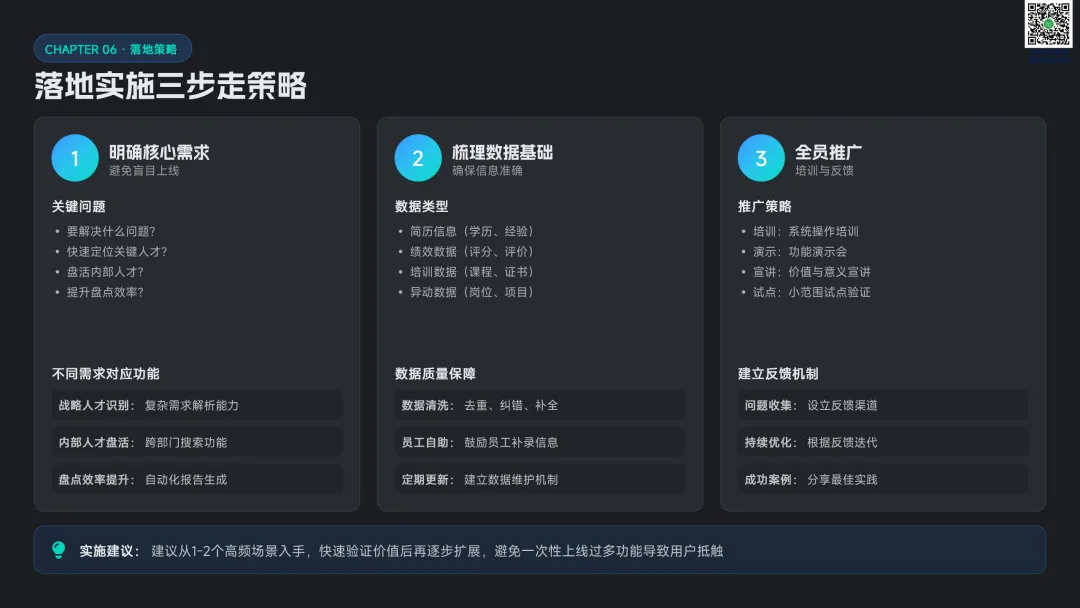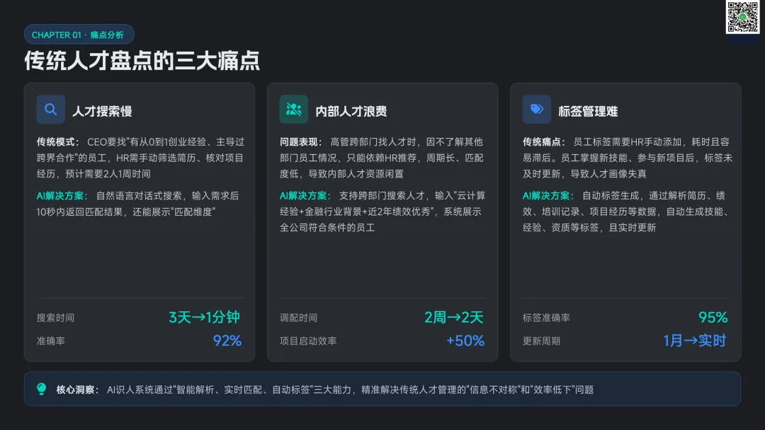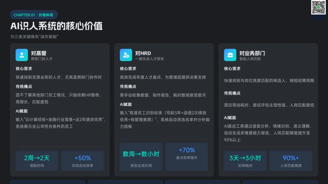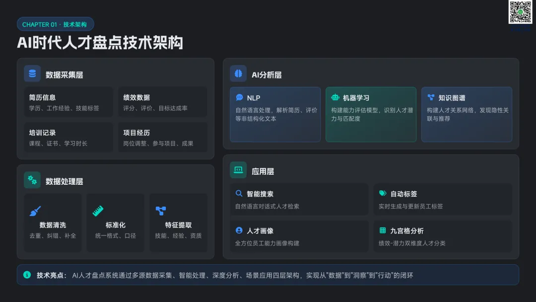 请点击图片放大查看点明传统人才盘点存在搜索慢、内部人才浪费、标签管理滞后三大痛点,AI 通过智能解析、实时匹配、自动标签实现效率与精度双提升。从高管、HRD、业务部门三类角色切入,展示 AI 在跨部门寻才、盘点报告、人岗匹配的核心价值,并介绍数据采集 — 处理 — 分析 — 应用四层技术架构。