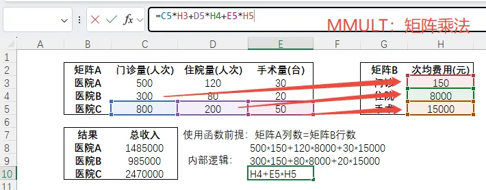 过去:构建状态转移矩阵和马尔可夫时间队列需要拖拽无数个单元格,稍有不慎就会引用错误。现在:通过 WRAPROWS将一列概率直接生成 4×4的转移矩阵,再用笔者喜欢举例说明:MMULT矩阵乘法见下图(WRAPROWS 过于简单不做说明)。A/B/C 3家医院,按门诊/住院/手术数量列出矩阵A,各自的费用为矩阵B,现在要算3家医院的总收入。常规算法是:医院A的门诊人数×门诊次均费用+住院人数×住院次均费用+手术台数×手术次均费用,即500*150+120*8000+30*15000=¥1485000。再依次算出医院B/C的总收入进行相加。当然进阶点的选手也可以使用 SUNPRODUCT进行计算。但是!现在仅需要使用MMULT一个函数就可以搞定计算。且由于矩阵计算逻辑,矩阵A(3行3列)×矩阵B(3行1列)其输出的结果会自然生成3行1列的新矩阵。聪明的读者们肯定一下子就想到了:每个周期的转移概率和队列人群,这不就是天然的两个矩阵!直接用 MMULT一步出结果且自动排版!!!实战意义:极大地压缩了模型的物理占地面积,让核心逻辑一目了然。2.空间折叠——数据堆叠与动态重构(VSTACK, HSTACK)