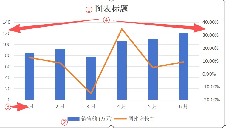 默认生成的图表有①图表标题,②图例,③水平坐标轴,④垂直坐标轴