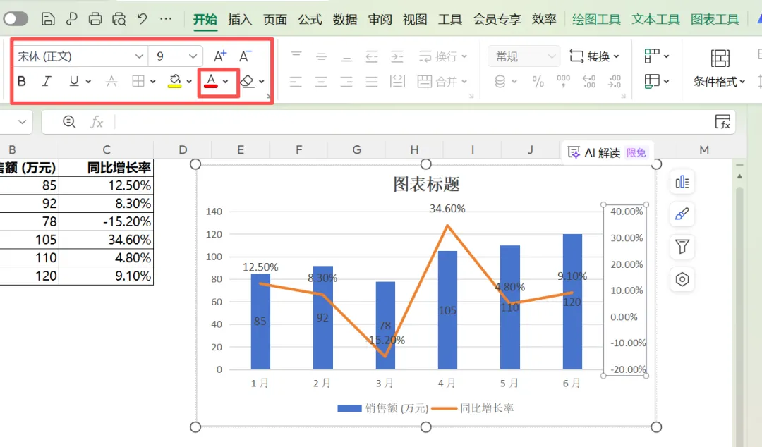 生成的图表字体和字号、颜色,都是默认的。