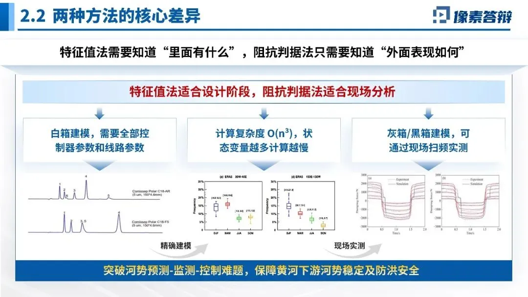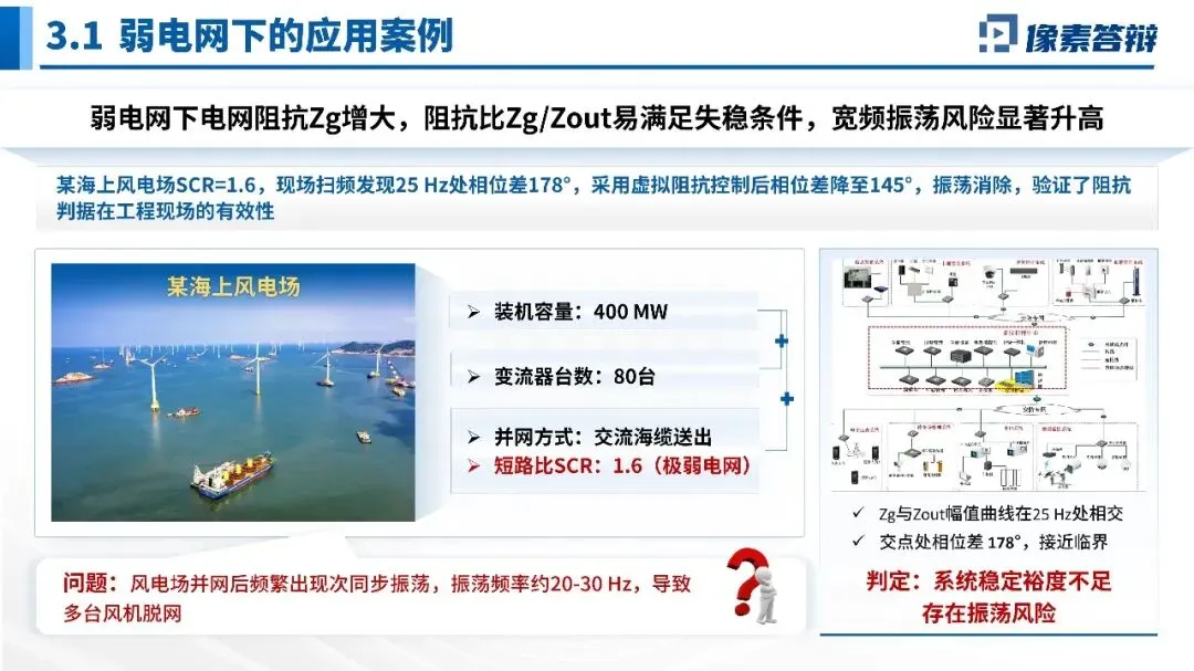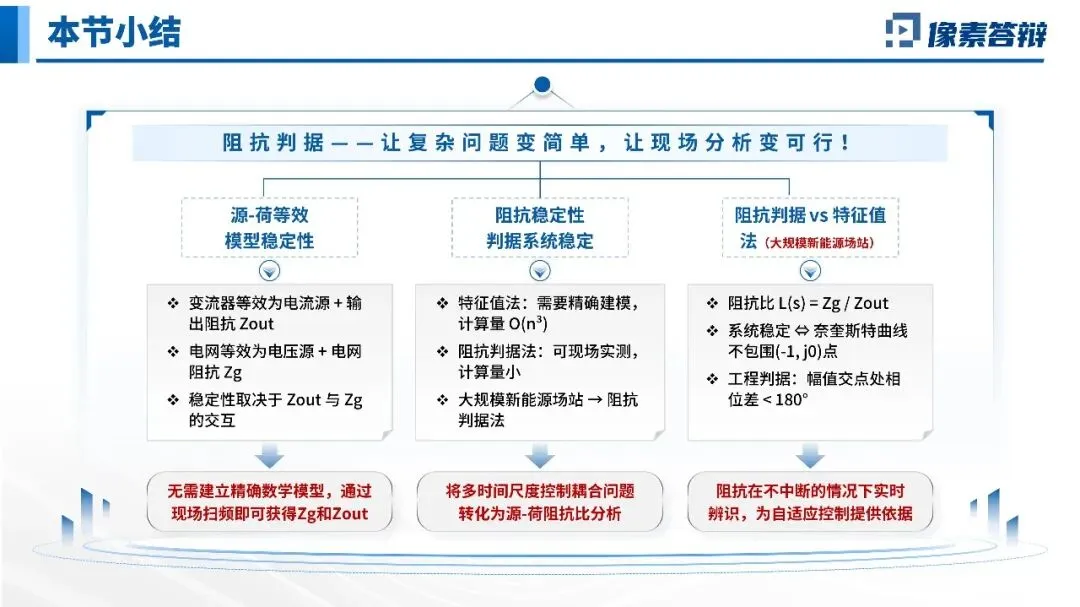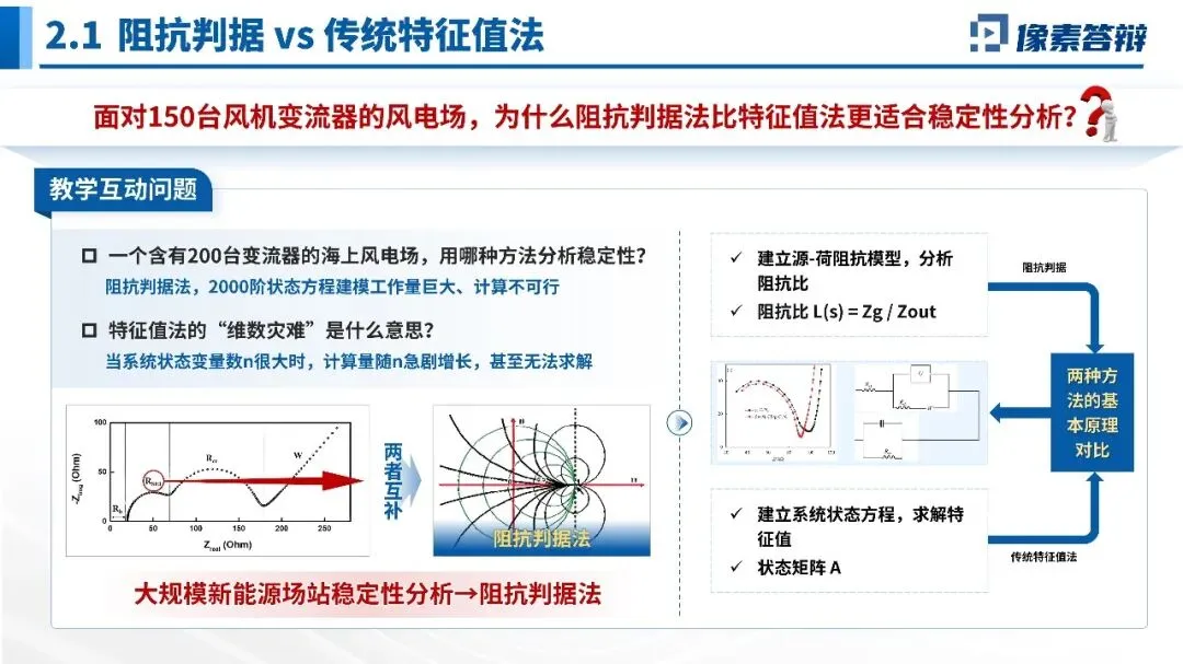 用200台风机风电场案例,说明特征值法面临“维数灾难”(2000阶状态方程),而阻抗判据可现场扫频实测,黑箱建模,计算量小,是工程现场的首选。