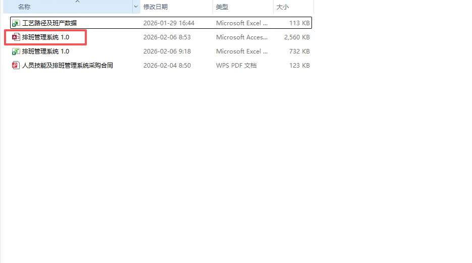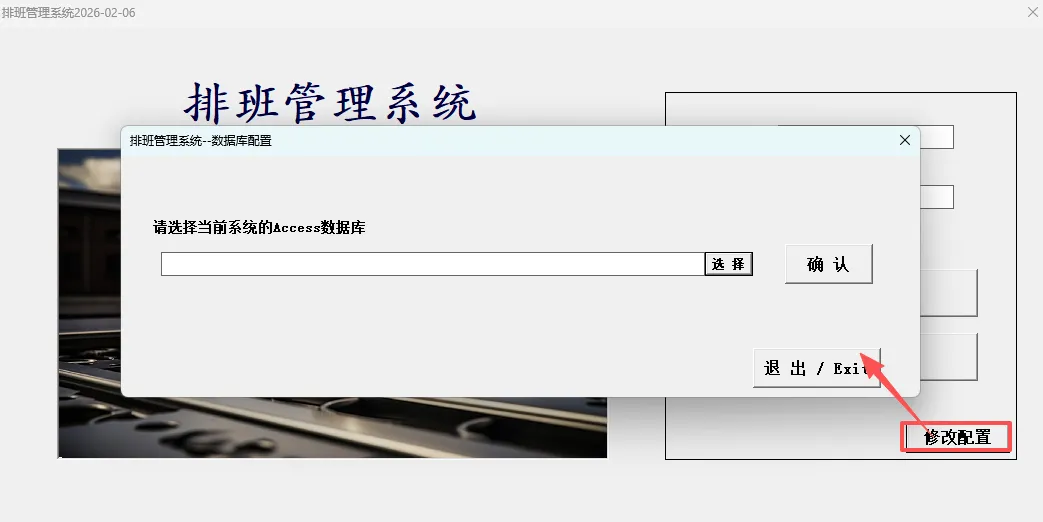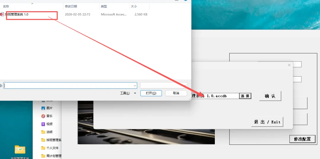 1.1数据库路径确认:选择“数据库”后,点击确认即可,系统会自动更新数据库的路径。如果是需要局域网内共享数据,可将.accdb的access数据库放在服务器或局域网电脑的共享盘,再选择共享的数据库路径即可。(共享的路径一般为 “\\SHARE-PC \排班管理系统1.0.ACCDB’”)