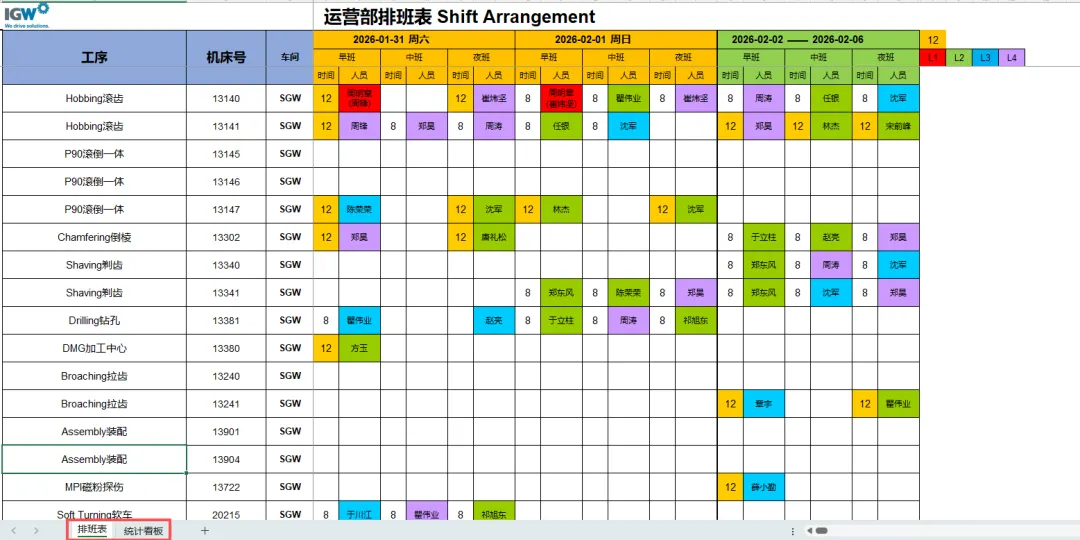 3、进入系统:登录后,系统自动进入排班表界面。进入系统后可查看排班表和统计看板两个工作表。可任意切换查看。