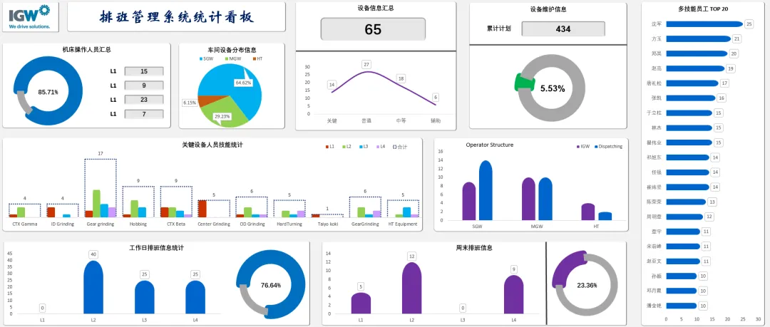 系统集成独立的数据分析看板,全方位统计关键指标:包括设备运行状态、人员技能等级分布、排班计划与执行情况。支持多维度查询,可实时查看个人或团队的出勤工时、设备累计运行时间及历史排班记录,为管理者提供数据驱动的决策支持。