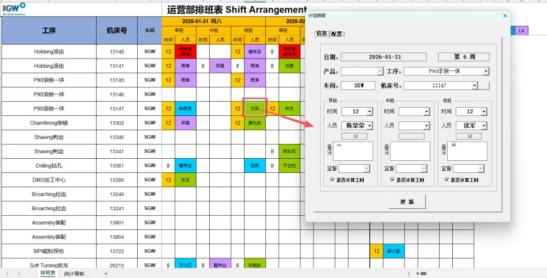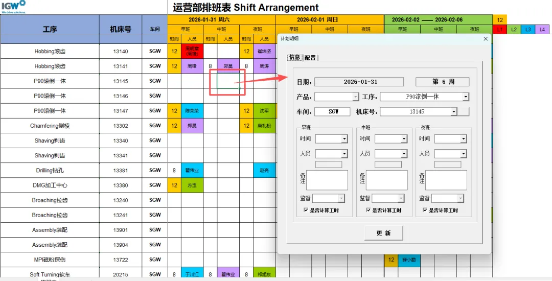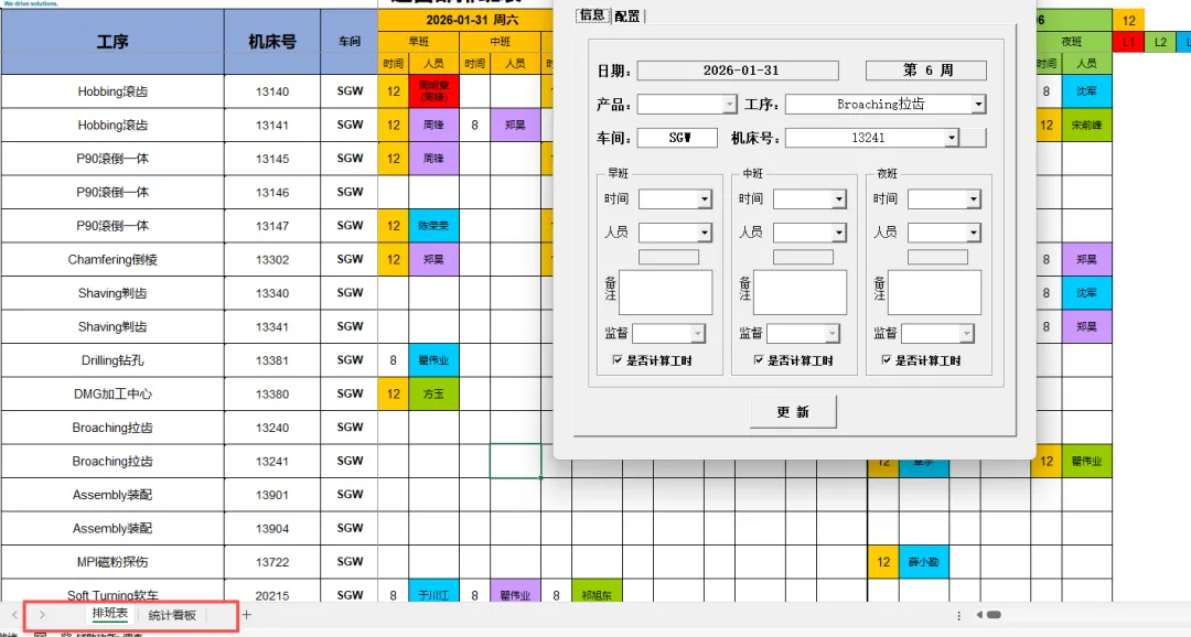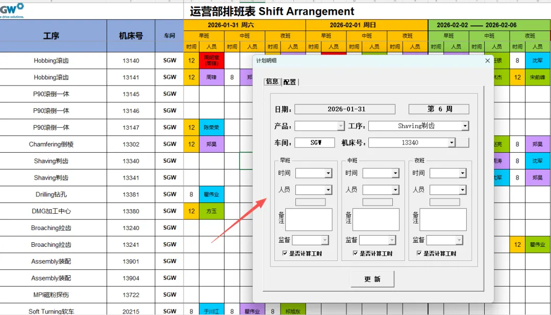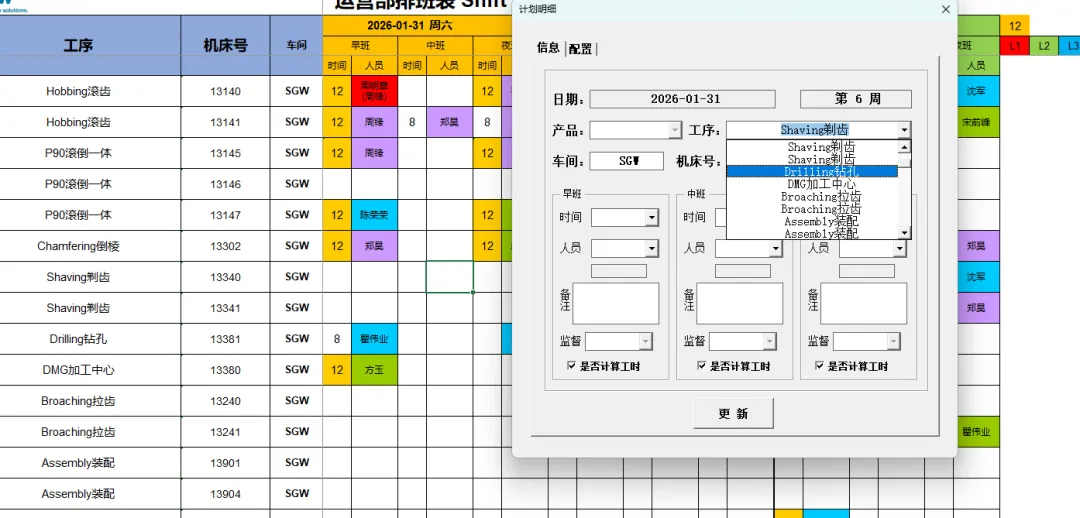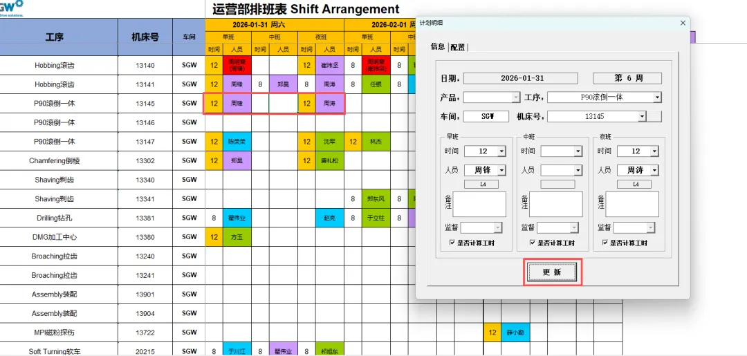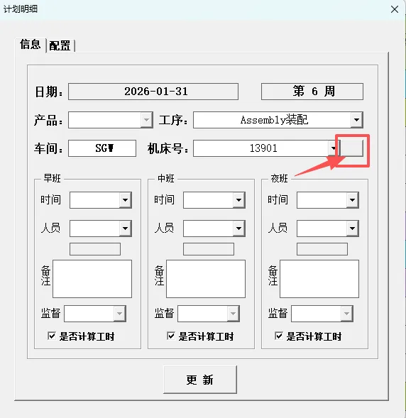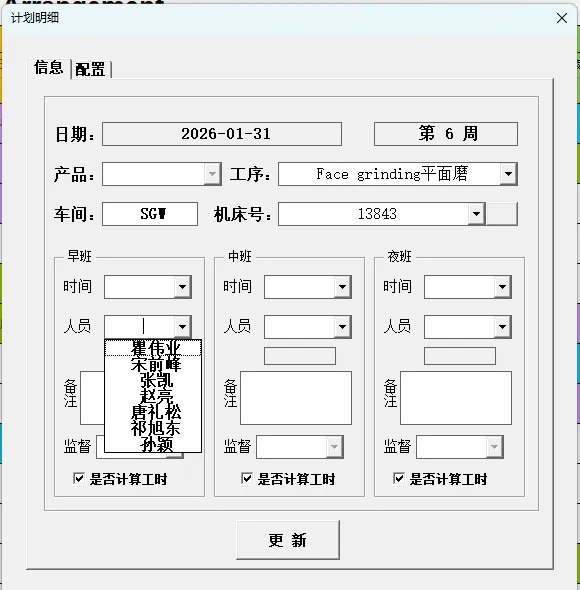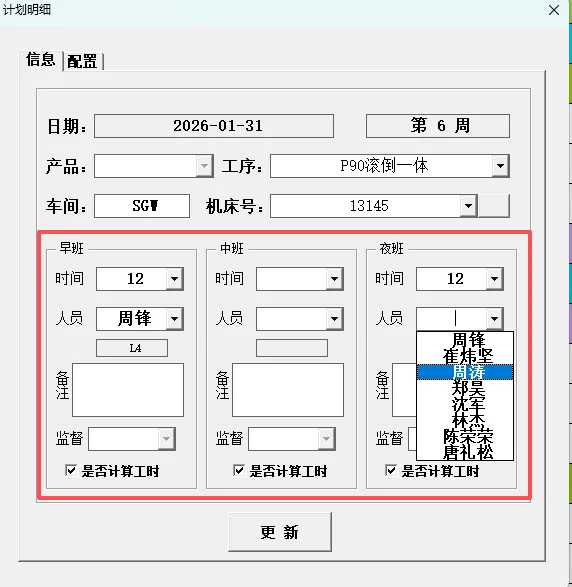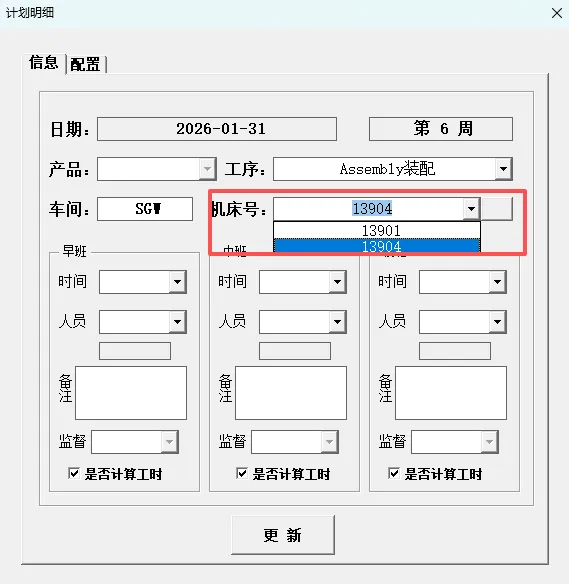 4.3.4.1 更新人员:更新其信息后需要手动点击“机床号”选择框后的空白按钮刷新人员信息。刷新后按照需要输入对应的排班信息后点击“更新”按钮即可。