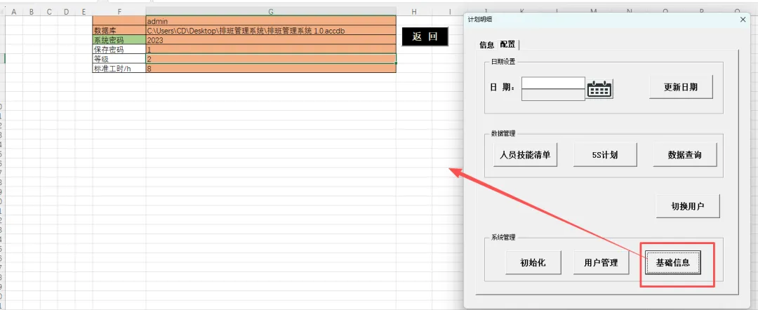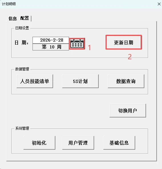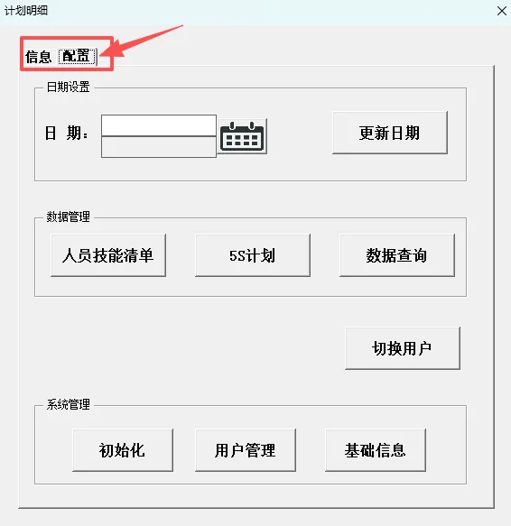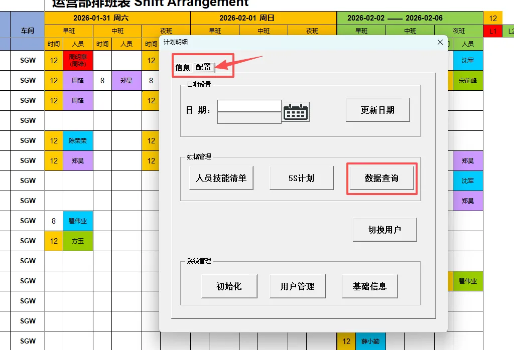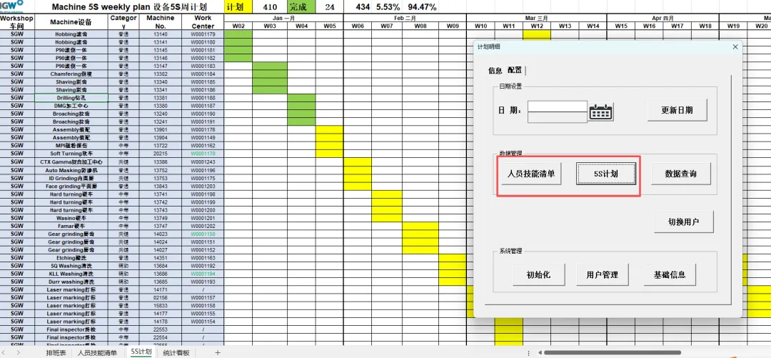 4.6 技能清单、5S计划:通过在配置界面点击对应按钮,可打开对应的工作表。(注:切换到排班表,再次通过双击打开排班信息录入框即可自动隐藏打开的表格)