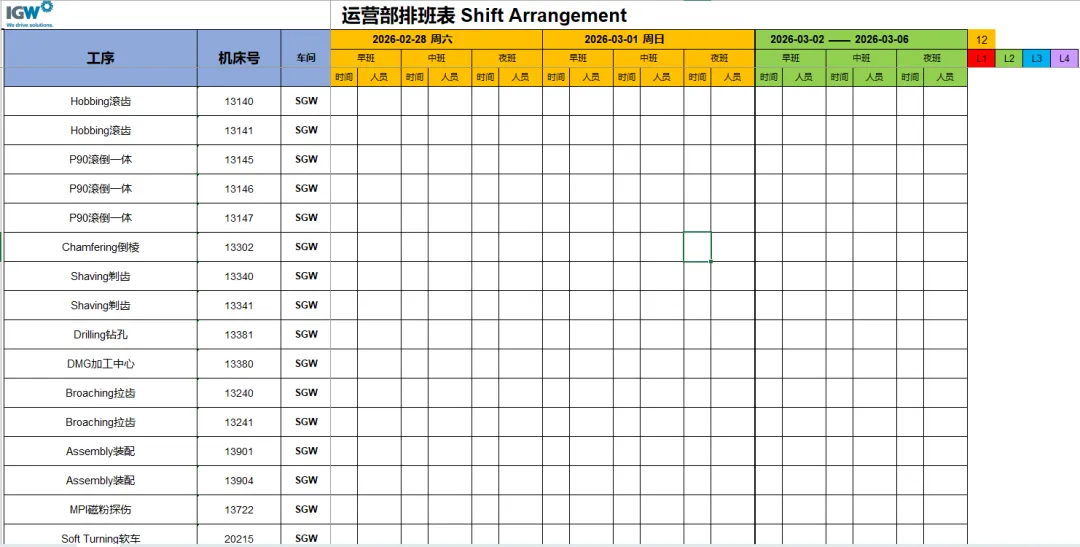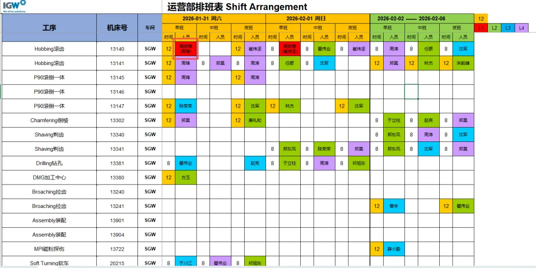 4.3.1 排班信息录入:根据获取的工序、机床号等信息;系统自动读取技能表中满足条件的人员信息。可通过下拉选择框选择。选择人员后自动显示对应人员的技能等级。当技能等级为“L1”时,必须选择监督人员。