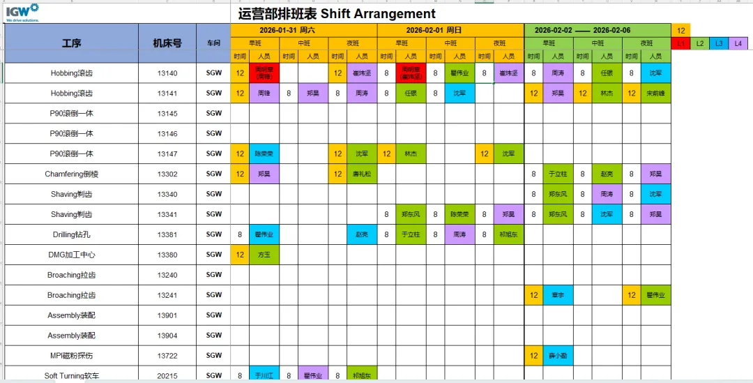 3、排班后自动根据人员技能等级信息填充其对应颜色,可修改右上角的人员对应颜色;修改后重新配置日期即可更新所有人员颜色信息。