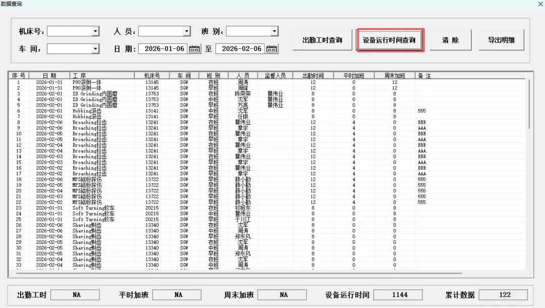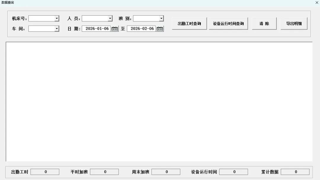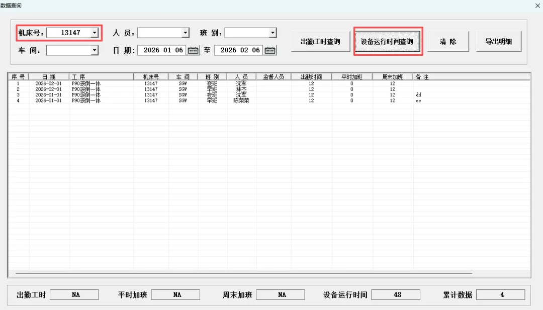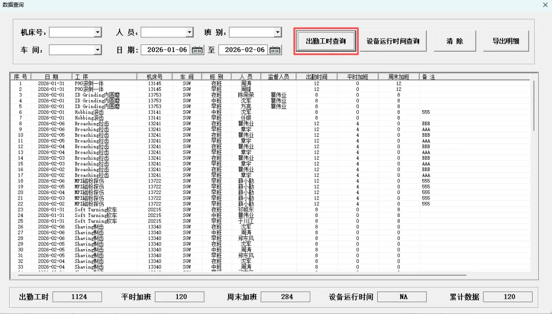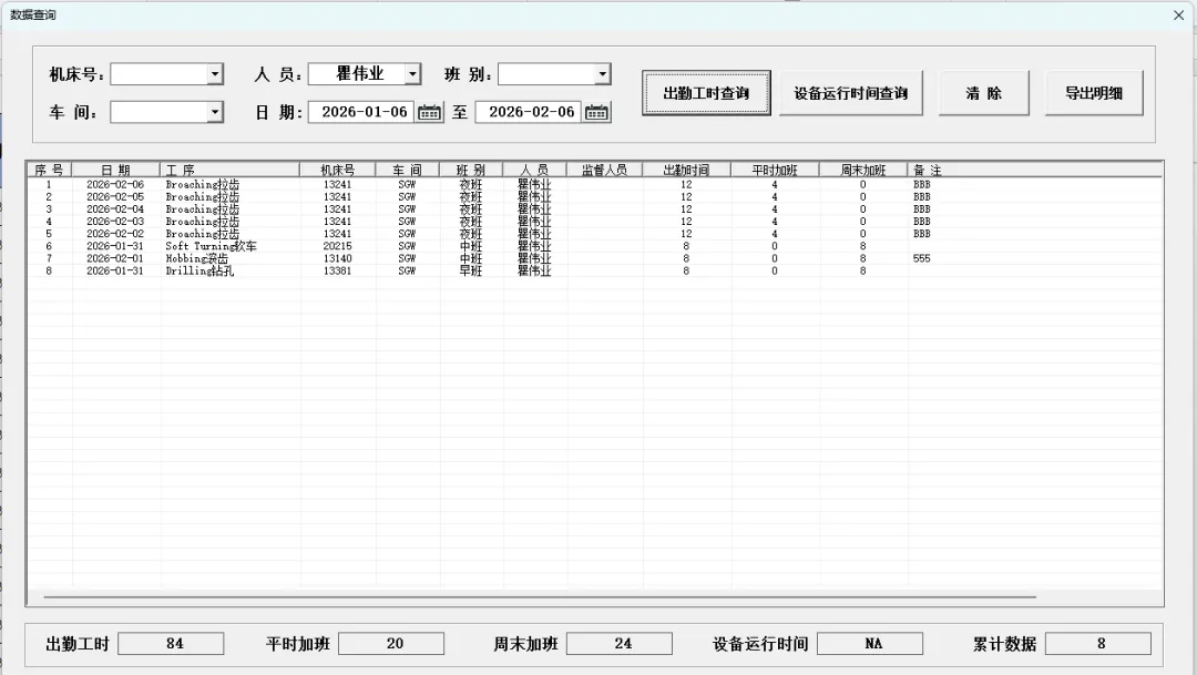 4.5.1 出勤工时查询:出勤工时查询可根据条件选择日期区间、机床号、人员、班别以及车间信息多条件筛选查询。查询后再下方信息统计框自动汇总对应信息。 查询后可点击“导出明细”按钮,将查询列表框内所有记录导出。