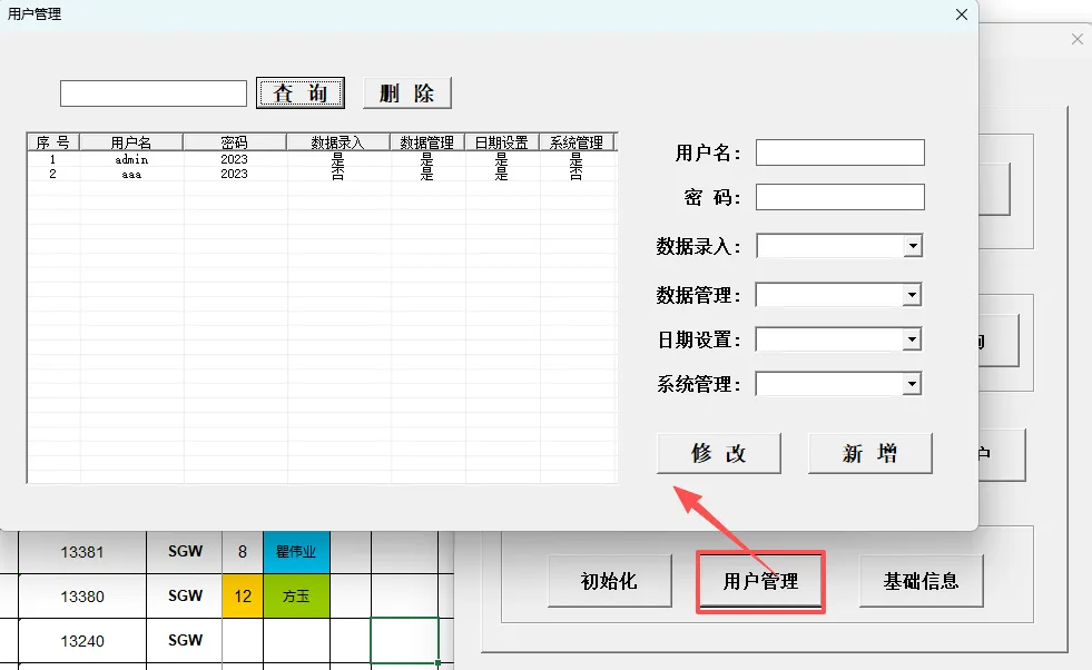 4.8.1 用户编辑:双击用户信息查询框的信息,可添加到右方信息输入框,修改其信息后点击“修改”既可。
