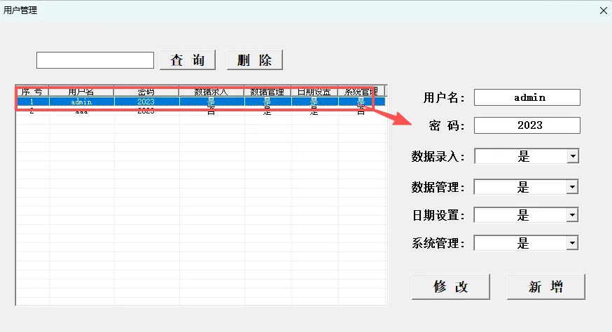 用户删除:在用户信息查询列表框选择要删除的用户后点击“删除”既可。