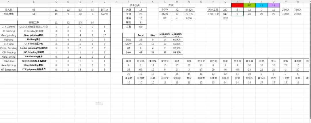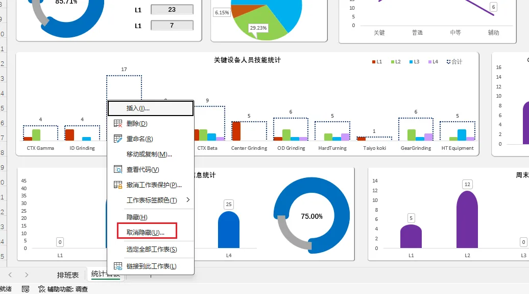 5 统计看板:统计看板信息来源于当前系统的技能表、排班表以及技能表。其信息读取可通过隐藏的“数据统计”工作表查看。