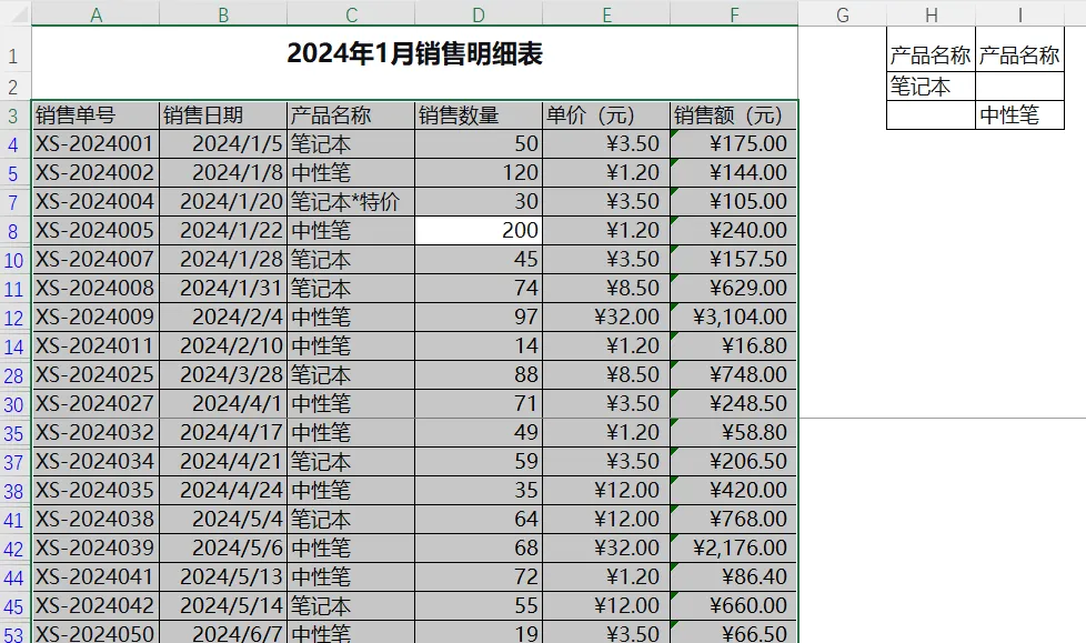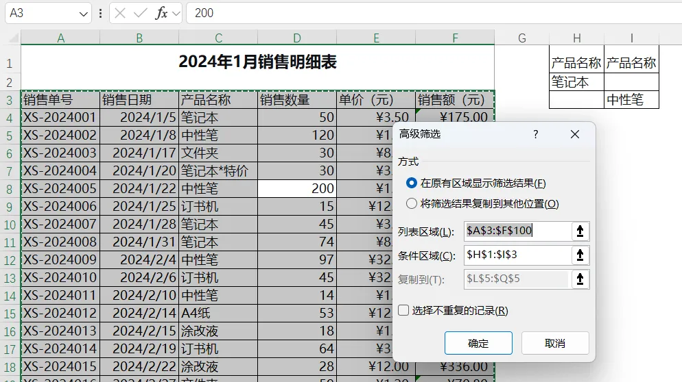 场景1:筛选出“笔记本”或“中性笔”的销售记录