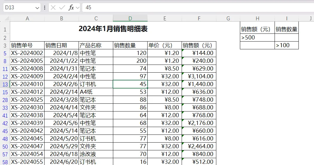 场景2:筛选出“销售额大于500”且“销售数量大于50”的记录(与关系)