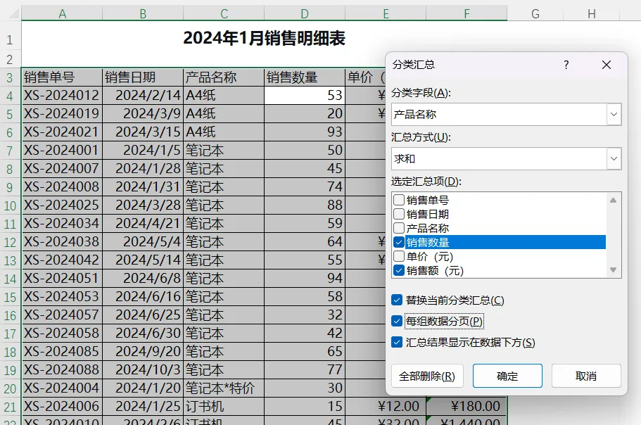 “选定汇总项”:勾选 “销售数量” 和 “销售额”。