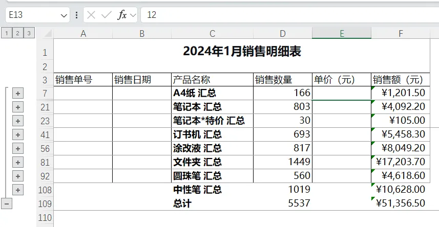 分类汇总可以快速对数据按某一字段进行分类,并计算每类的汇总值(求和、平均值等),同时生成分级显示,非常直观。