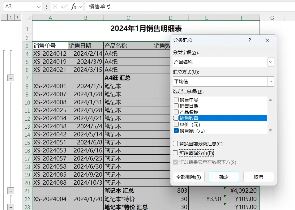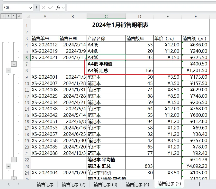 现在每个产品组下面有两行汇总:一行销售数量总和,一行销售额平均值。