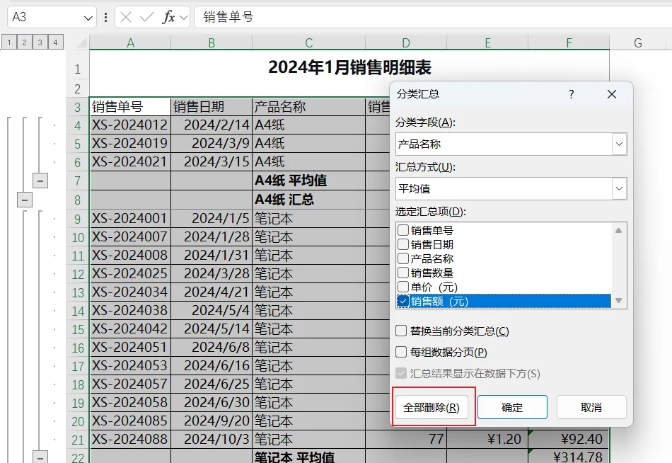 分类汇总可以嵌套。比如先按产品汇总销售数量总和,再按产品汇总销售额平均值。