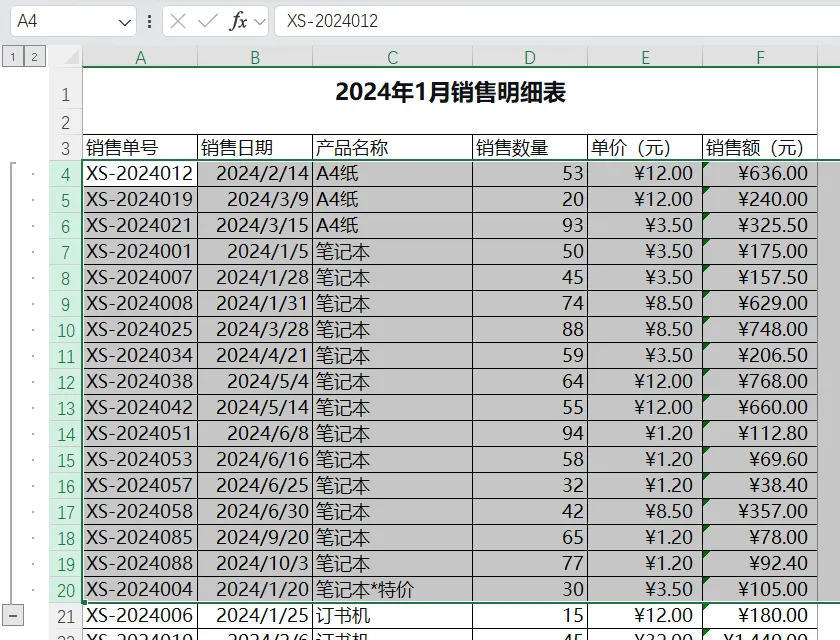 继续使用 “销售练习-我的名字.xlsx” 文件,以“1月销售记录”工作表为基础。为了练习效果,请确保数据至少有20行以上,包含多种产品名称和不同的销售额。