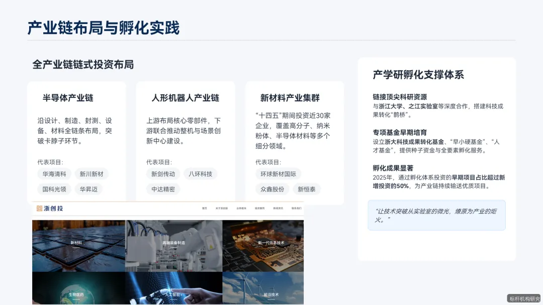 “十四五” 期间,浙创投在新材料领域累计投资近 30 家企业,实现了 “由点及线、由线成面” 的体系化产业集群打造,核心投资成果包括: