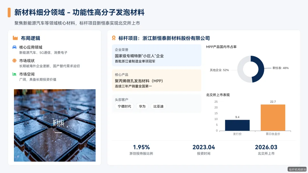 新恒泰是浙创投在该领域的核心投资项目,公司专注于 EVA、TPU、IXPE、MPP(超临界发泡材料)的研发与产业化,是国家级专精特新 “小巨人” 企业、首批浙江省制造业单项冠军。其核心产品聚丙烯微孔发泡材料(MPP)国内市占率高达 48%,连续三年产销量全国第一,在新能源电池缓冲垫、5G 微波天线市场占有率位居全国前列,深度绑定宁德时代、华为、比亚迪等头部企业。