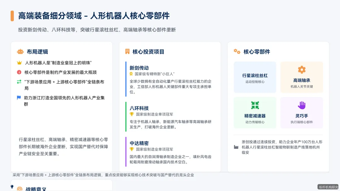 高端装备制造产业是浙创投的王牌核心赛道,也是其投资成果最具标志性、行业影响力最大的赛道。浙创投在该领域的布局,紧扣 “制造强国” 战略,聚焦高端装备领域的卡脖子技术突破,围绕人形机器人核心零部件、高端摩托车与汽摩配、精密加工与工业刀具、高端轴承、流体装备、矿山工程机械等细分领域,坚持 “链主企业引领、全产业链协同布局” 的逻辑,培育了一批打破海外垄断、站上世界舞台的国产高端装备龙头企业。