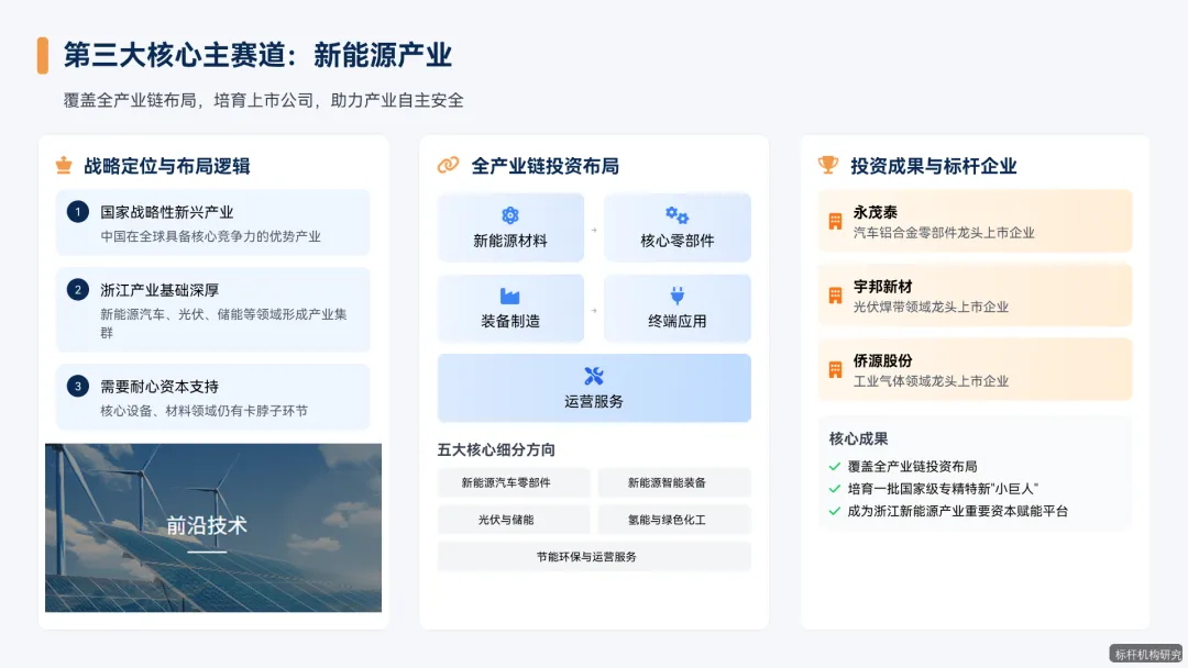 新能源产业是浙创投重点布局的第三大核心主赛道,紧扣国家 “双碳” 战略目标与浙江省新能源产业升级方向,聚焦新能源汽车、储能、光伏、氢能、锂电智能装备等细分领域,围绕新能源产业链上下游核心环节进行系统性布局,重点投资具备核心技术、能够实现国产替代、助力能源结构转型的优质企业。