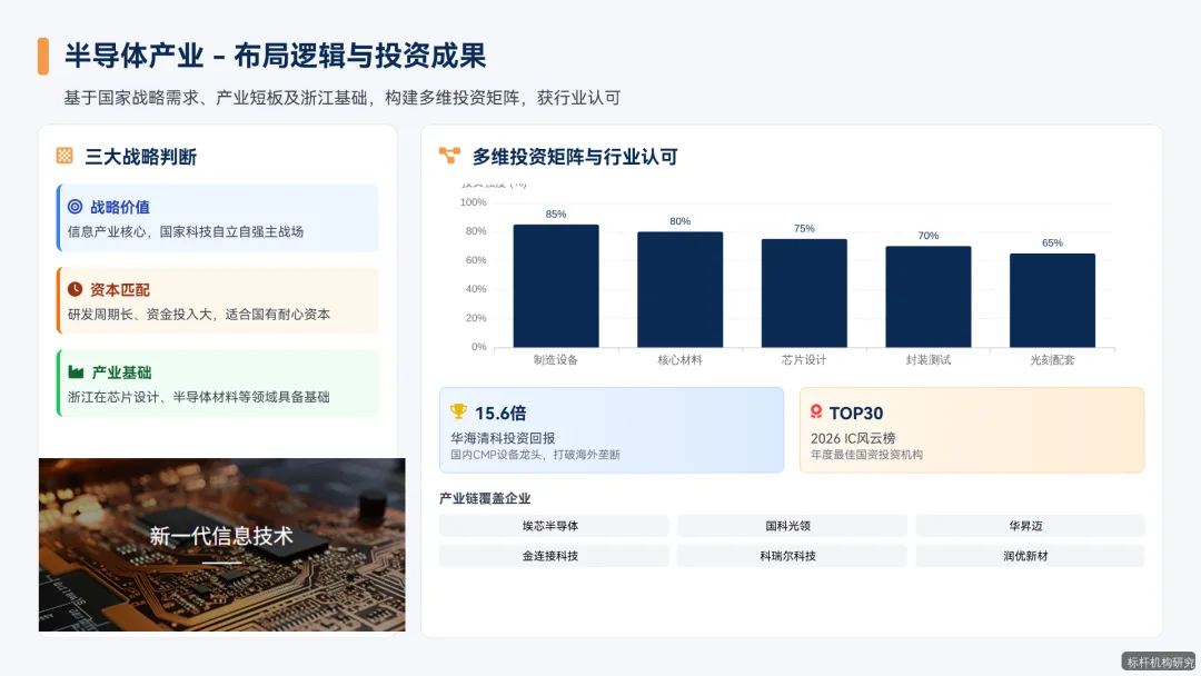 新一代信息技术产业,尤其是半导体 / 集成电路产业,是浙创投重点布局的核心延伸赛道,也是其 “投硬科技、突破卡脖子” 战略的核心方向。浙创投在该领域的布局,聚焦国家集成电路产业发展重大布局,瞄准 “国内空白” 领域,深入研究产业链投资思路和筛选框架,围绕芯片设计、制造设备、关键材料、封装测试全链条进行系统性投资,构建了多维投资矩阵,成为推动半导体产业链突破卡脖子技术的重要资本力量。