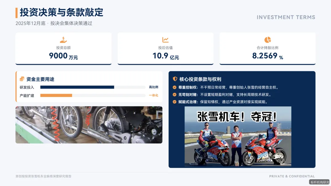 数据来源:《张雪背后的投资经理我们找到了》《浙江国资投资张雪全复盘》《投后动态 | 历史首冠!浙创投所投企业张雪机车世界顶级赛事夺冠》《去年 8 月接触今年 1 月 9000 万元领投浙江国资为何敢投张雪机车》。