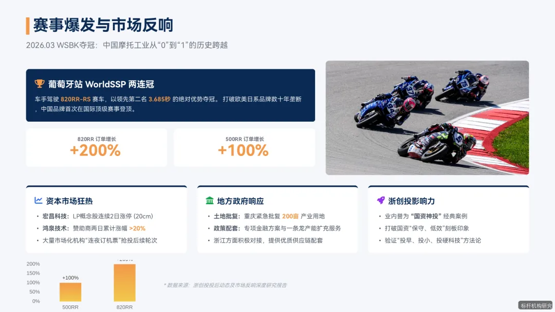 2026 年 3 月,浙创投投资的张雪机车在WSBK 世界超级摩托车锦标赛连夺两冠,打破了欧美日系品牌数十年的赛事垄断,成为中国高端装备制造走向世界的标志性事件,也让浙创投在高端装备制造领域的投资布局获得了全行业的高度认可。