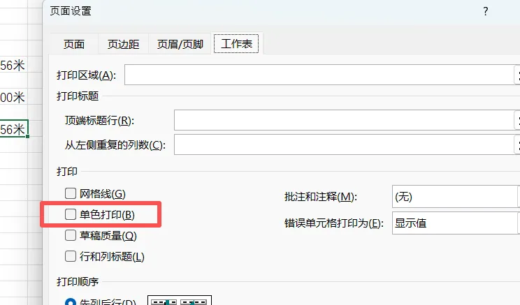 检查Excel打印设置:点击「文件」→「打印」,在打印预览界面,点击「页面设置」→「工作表」,勾选「打印单元格颜色和底纹」,取消勾选「草稿质量」(草稿模式不打印颜色)。